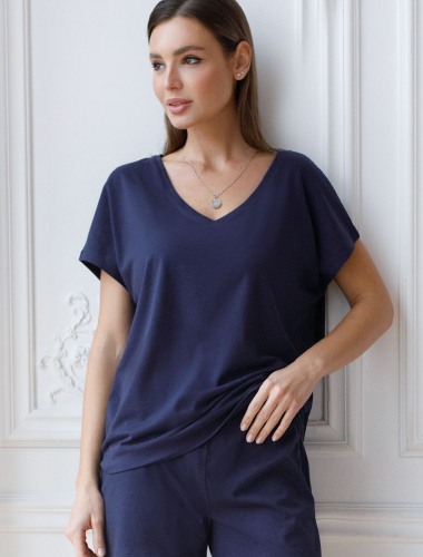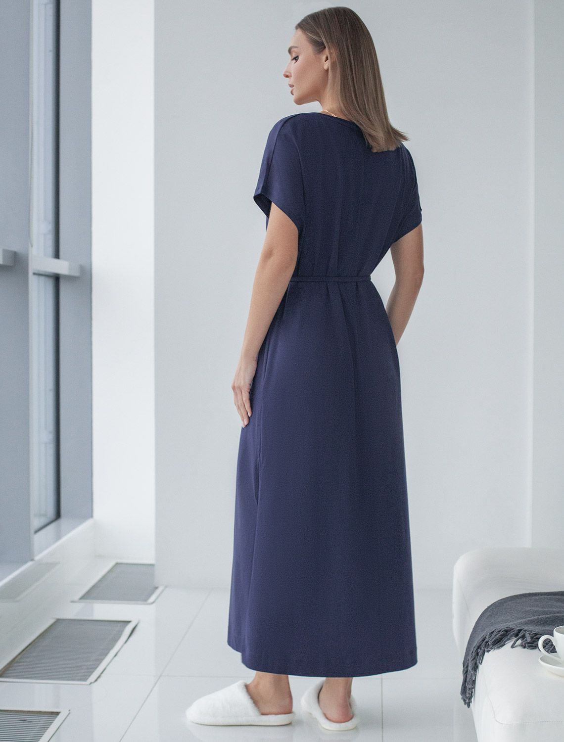 Длинное платье темно-синего цвета с V-вырезом из премиального 100% хлопка плотностью 140 Г/м2 сочетает в себе легкость и благородный стиль. Главная особенность этого изделия — тонкое кулирное полотно, которое легче и воздушнее стандартного трикотажа. Благодаря своей деликатной текстуре модель идеально подходит для домашних образов и пижамных комплектов. Ткань отлично «дышит», обеспечивая максимальный уют во время сна и отдыха. Женственный образ подчеркивает красивое декольте и тонкий пояс, который позволяет регулировать посадку по талии и создает А- силуэт. Модель украшена элегантным высоким разрезом сбоку, добавляющим свободы движению и нежности силуэту. Дышащий материал отлично подходит для теплой весны и лета, не теряет вида после длительного ношения, обеспечивая комфорт даже в жаркую погоду. Короткий цельнкроеный рукав добавляет свежести и удобства, делая платье универсальным для разных сезонов и случаев. Представленная широкая размерная линейка позволяет выбрать подходящий вариант для любой фигуры, в том числе и на большие размеры. Платье А-силуэта и длины макси подойдет девушкам и женщинам на низкий рост, а так же на высокий рост. Стильное платье гармонично сочетается с разными аксессуарами, помогая создавать как повседневные, так и более нарядные образы. Отсутствие сложных деталей делает это повседневное платье удобным для тех, кто ценит простоту и стиль одновременно. Будьте шикарной женщиной в этом красивом платье даже дома.