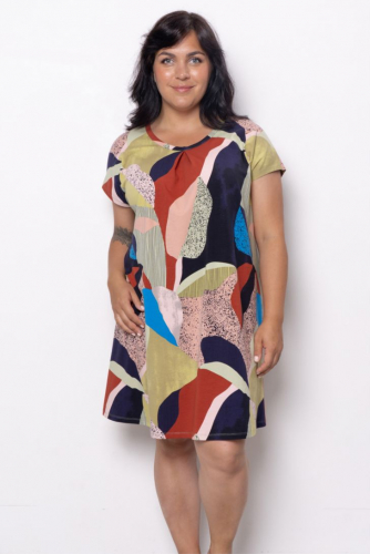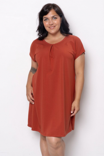 Платье свободного кроя со спущенной линией плеча. Вырез горловины круглый, декорирован встречными складками, которые образуют мягкую драпировку по линии груди. Модель представлена в 4 цветовых решениях.