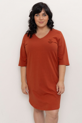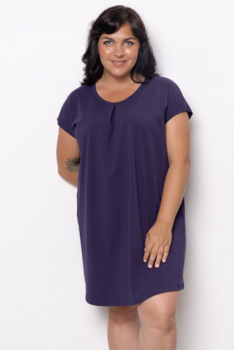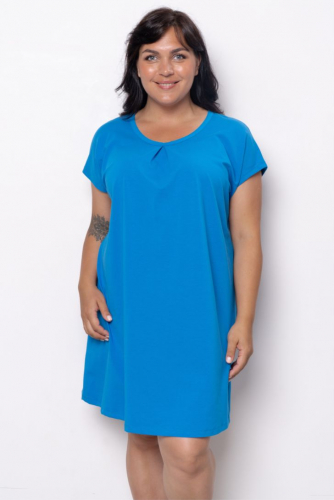 Платье свободного кроя со спущенной линией плеча. Вырез горловины круглый, декорирован встречными складками, которые образуют мягкую драпировку по линии груди. Модель представлена в 4 цветовых решениях.