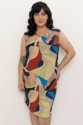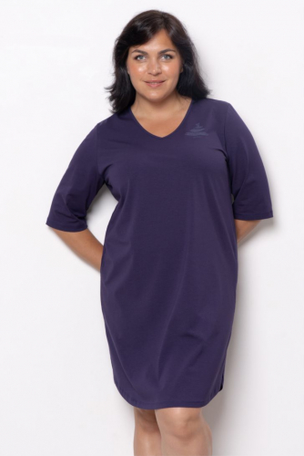 Платье женское свободного кроя. V- образный вырез горловины элегантно подчеркивает линию шеи, визуально ее удлиняя. Длина рукава ¾. У платья фигурный низ. По линии груди размещен тематический принт. Модель представлена в трех цветовых решениях.