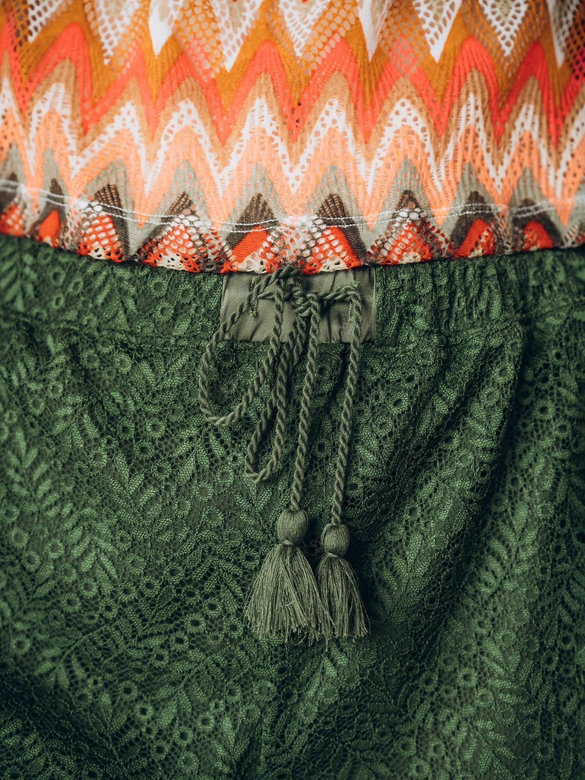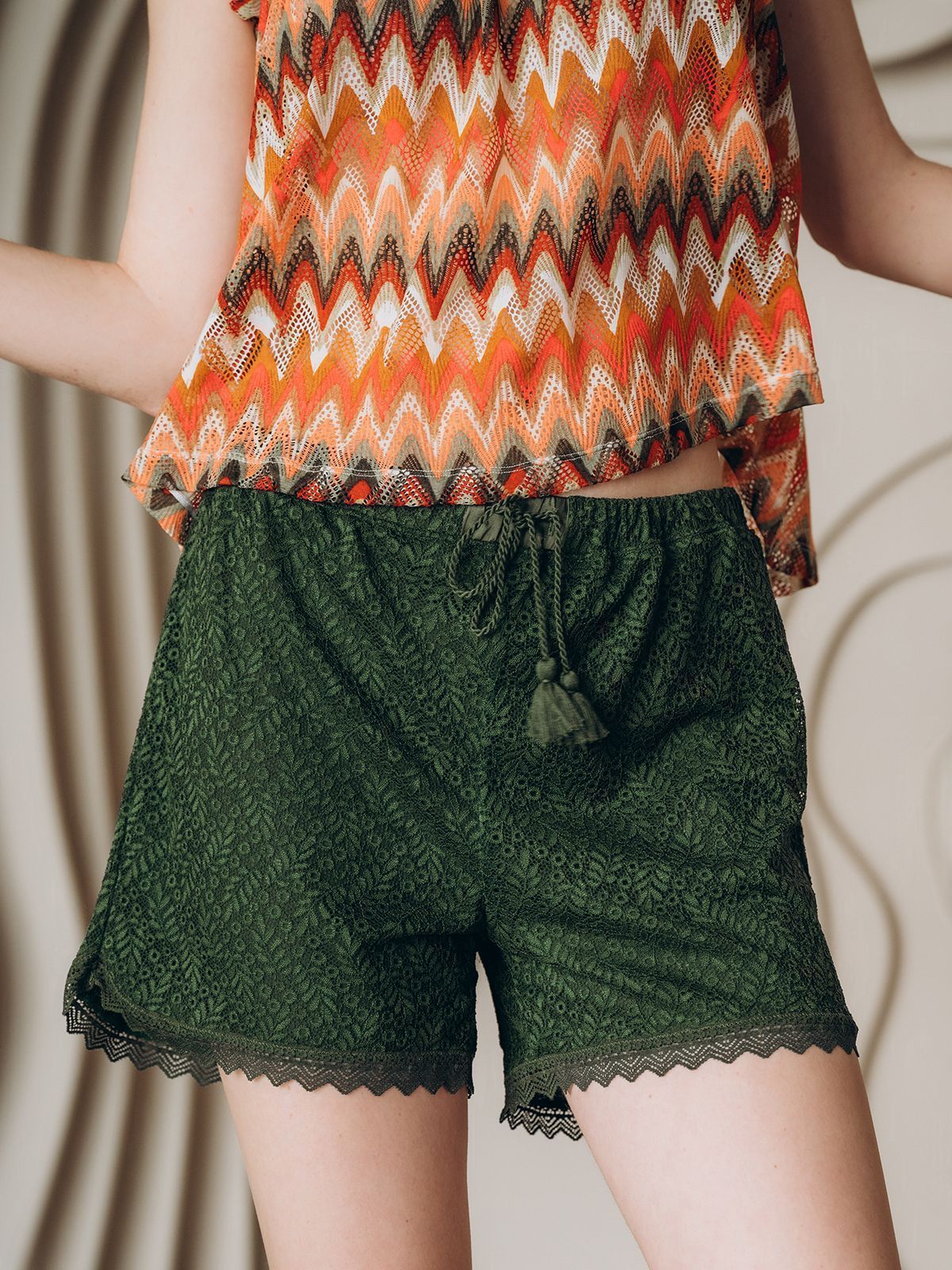 Шорты зелёного цвета украшены кружевом на нижних вырезах, добавляя нежности и утончённости.