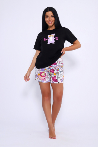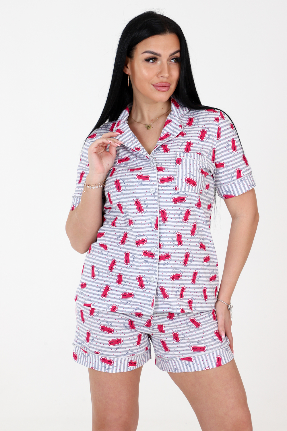 Пижама женская, выполнена из трикотажного набивного полотна кулирка. Пижама состоит из блузы и шорт.