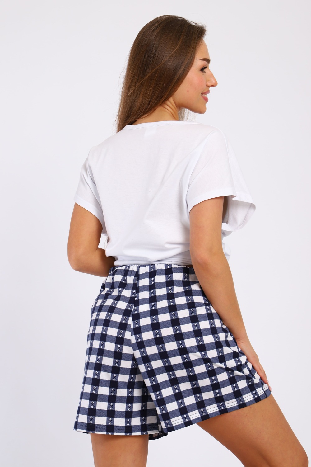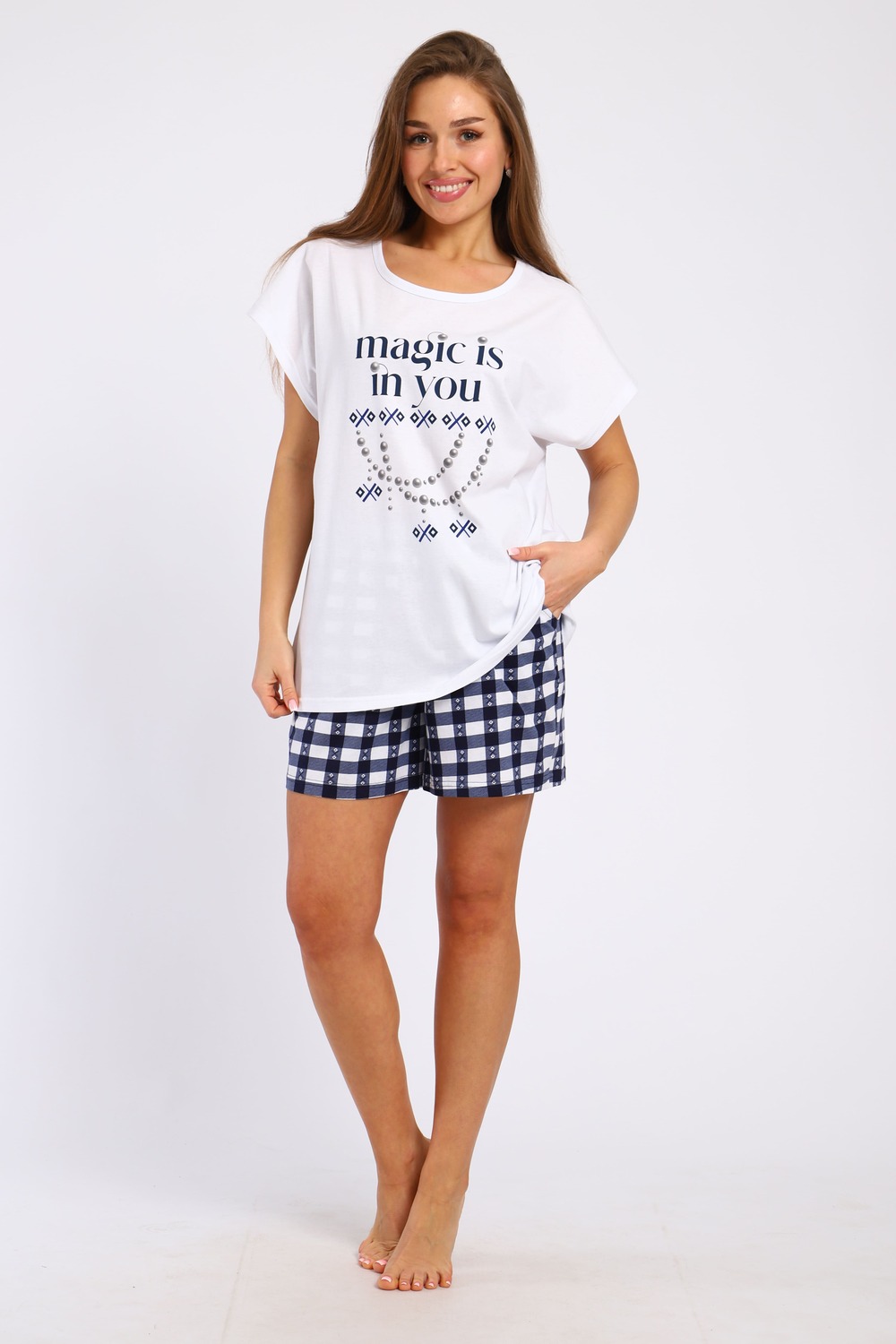 Костюм с шортами выполнен из трикотажного полотна кулирка. Костюм состоит из футболки и шорт. Футболка свободного силуэта, спущенное плечо, углубленная пройма, горловина окантована, на полочке выполнена печать. Шорты с притачным поясом на резинке, карманы в боковых швах. Цвет: разноцветные; Материал: кулирка;кулирка; Состав: 100% Хлопок.
