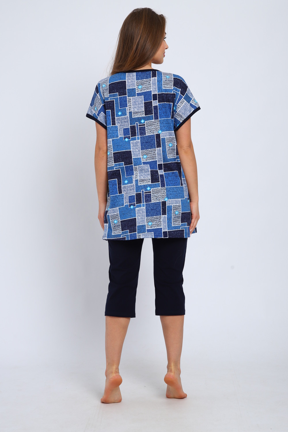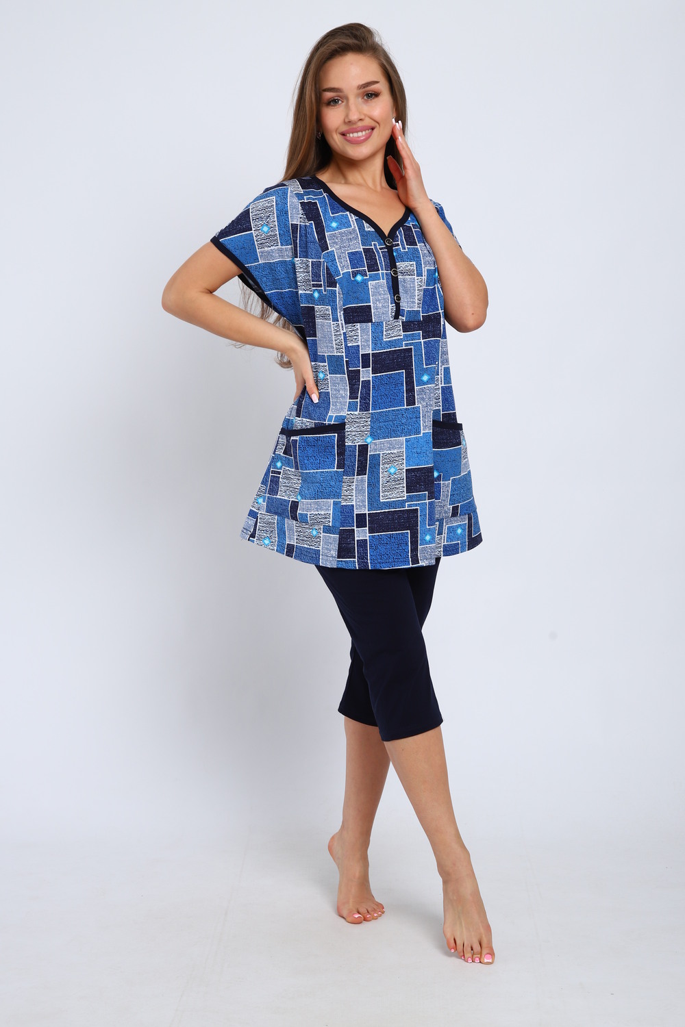 Костюм выполнен из трикотажного полотна кулирка. Костюм состоит из туники и бридж. Туника выполнена из набивного полотна. Силуэт свободный. На полочке рельефы, спущенное плечо, углубленная пройма. Подрез ниже груди, V- й вырез горловины. Имитация застежки до подреза. Карманы в подрезных бочках. Горловина, застежка низ рукава, карман окантованы тканью компаньон. Бриджи прямые, притачной пояс на резинке. Цвет: голубой; Материал: кулирка;кулирка; Состав: 100% Хлопок.