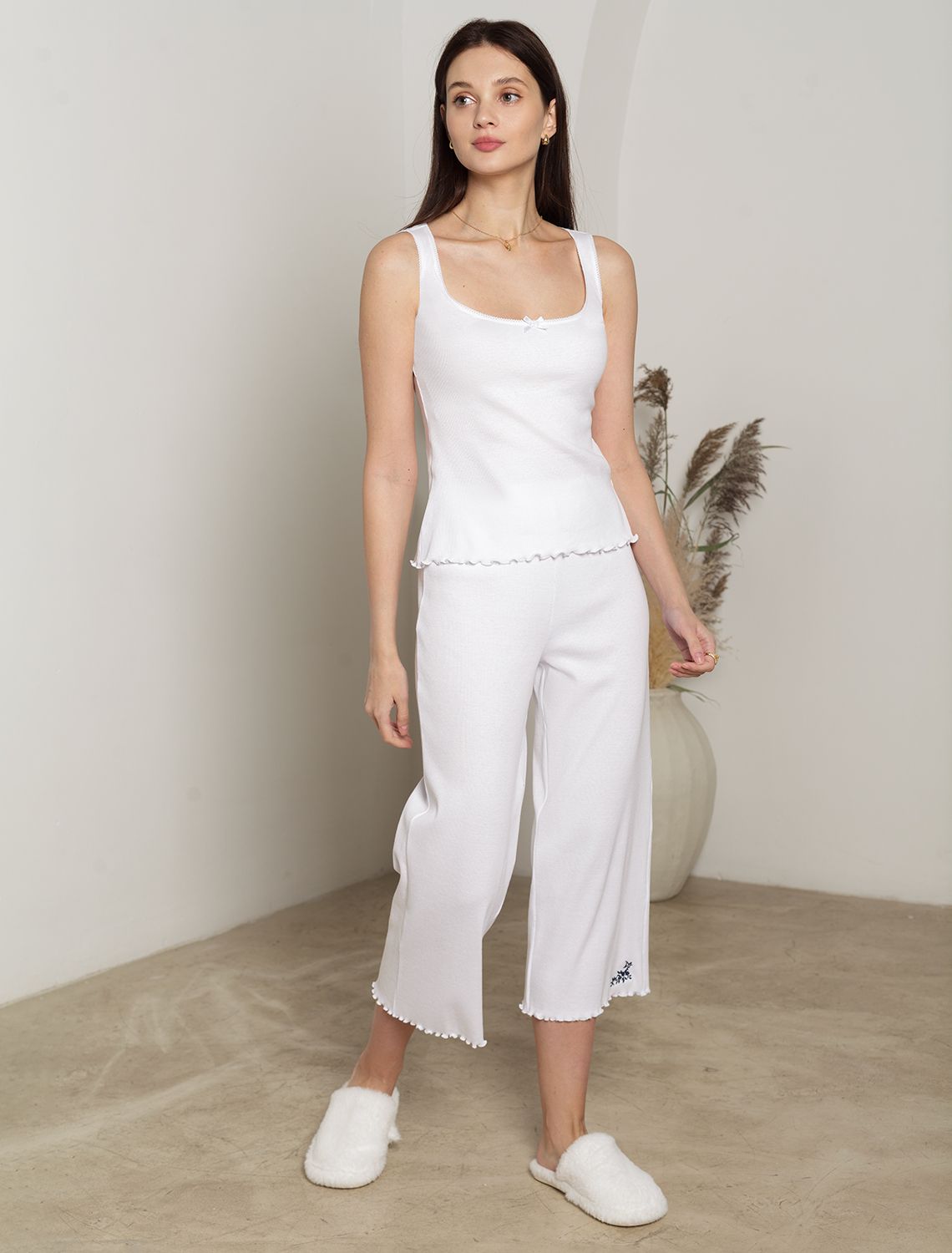 Прямые укороченные брюки белого цвета с поясом на тонкой резинке из фактурного трикотажа в рубчик созданы для вашего ежедневного комфорта.Невероятно комфортные и легкие, они создают ощущение нежного прикосновения к коже благодаря тонкой структуре материала. Особенность полотна - трикотаж кашкорсе удивительной мягкости, намного мягче стандартных вариантов, подходящий для расслабленных домашних и пижамных образов. Хлопок обеспечивает максимальный комфорт даже в течение длительного времени и позволяет коже дышать, а эластан дарит безупречную посадку на различные типы фигуры, в том числе и большие размеры и позволяет свободно двигаться. Особое внимание уделено поясу на резинке, который обеспечивает удобную посадку без давления и дискомфорта даже на большие размеры. Такие брюки с аккуратной вышивкой в виде цветов подойдут к романтическому образу. Выбирая эти домашние капри, вы получаете удобство и стиль в одном решении, ведь домашние и повседневные задачи будут проходить с максимальным комфортом. Красивые брюки сохранят свой внешний вид даже при активной эксплуатации, ткань не теряет форму. Брюки подходят для создания уютного образа на каждый день, легко сочетаются с другими предметами гардероба для прогулок и уютных вечеров. Приятная рельефная фактура ткани и аккуратный дизайн создают баланс между стилем и удобством, что особенно важно при выборе повседневных брючек.