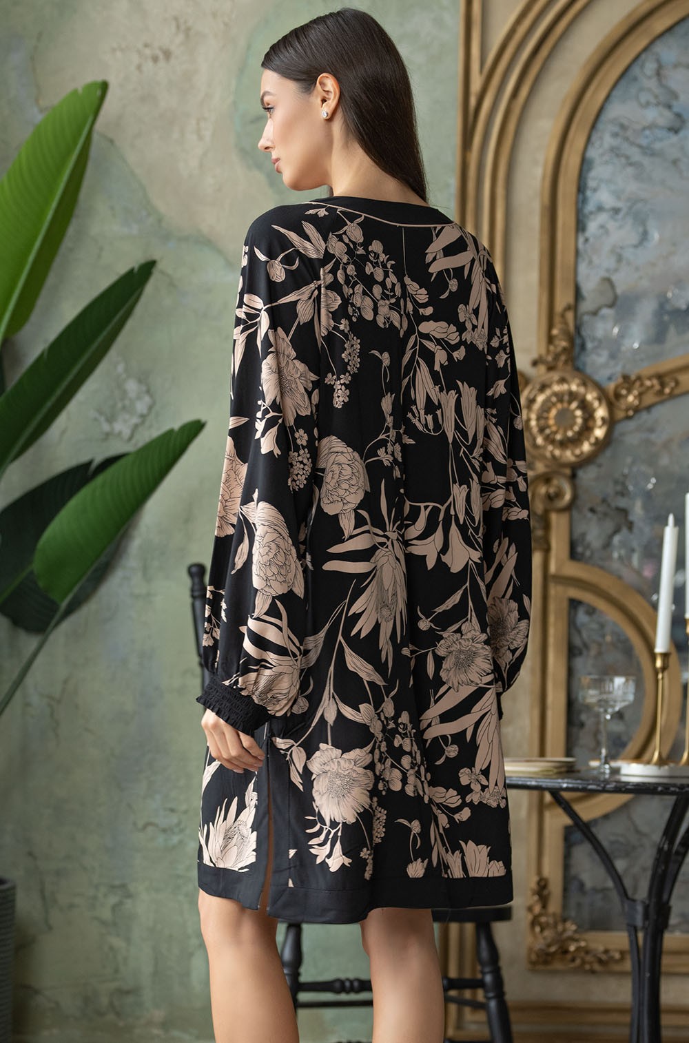 Короткая туника Mia-Amore свободного силуэта с длинным рукавом. Изделие выполнено из принтованной тканой вискозы с однотонной отделкой с контрастными кантами проходящими по границе двух материалов. В боковых швах расположены карманы. По низу изделия обработаны разрезы для свободы движения. Линию талии можно подчеркнуть за счет пояса, который идет в комплекте.