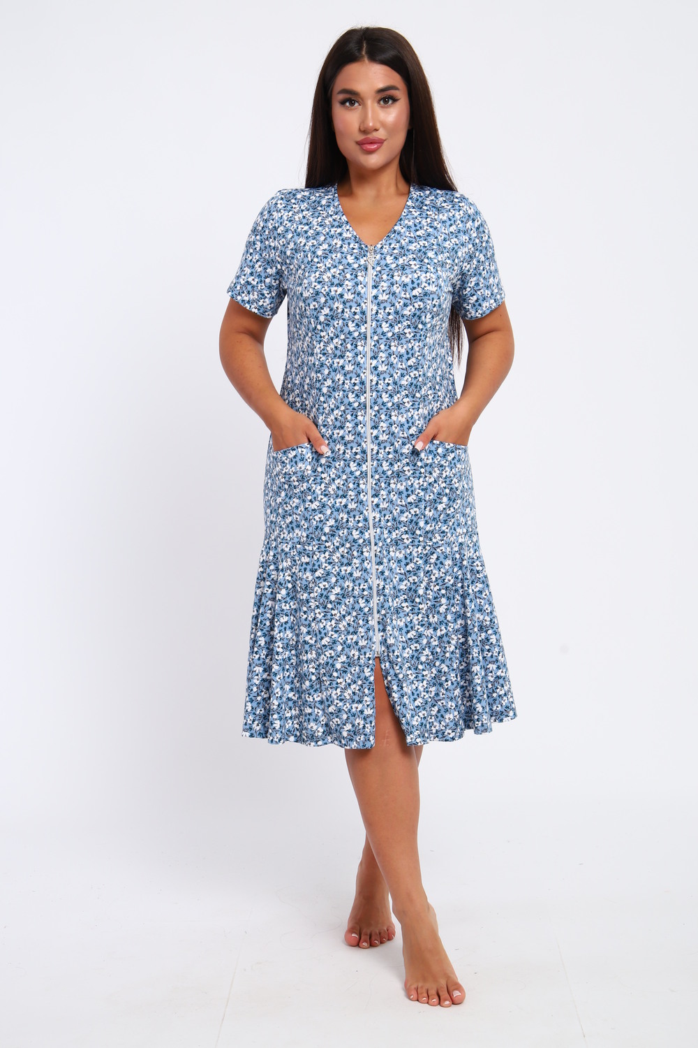 Халат женский с коротким рукавом на молнии выполнен из кулирки 100% хлопок. Горловина обработана узким кантом из основной ткани, по бокам карманы, внизу расклешение. Халат идеально подойдет для дома и отдыха.