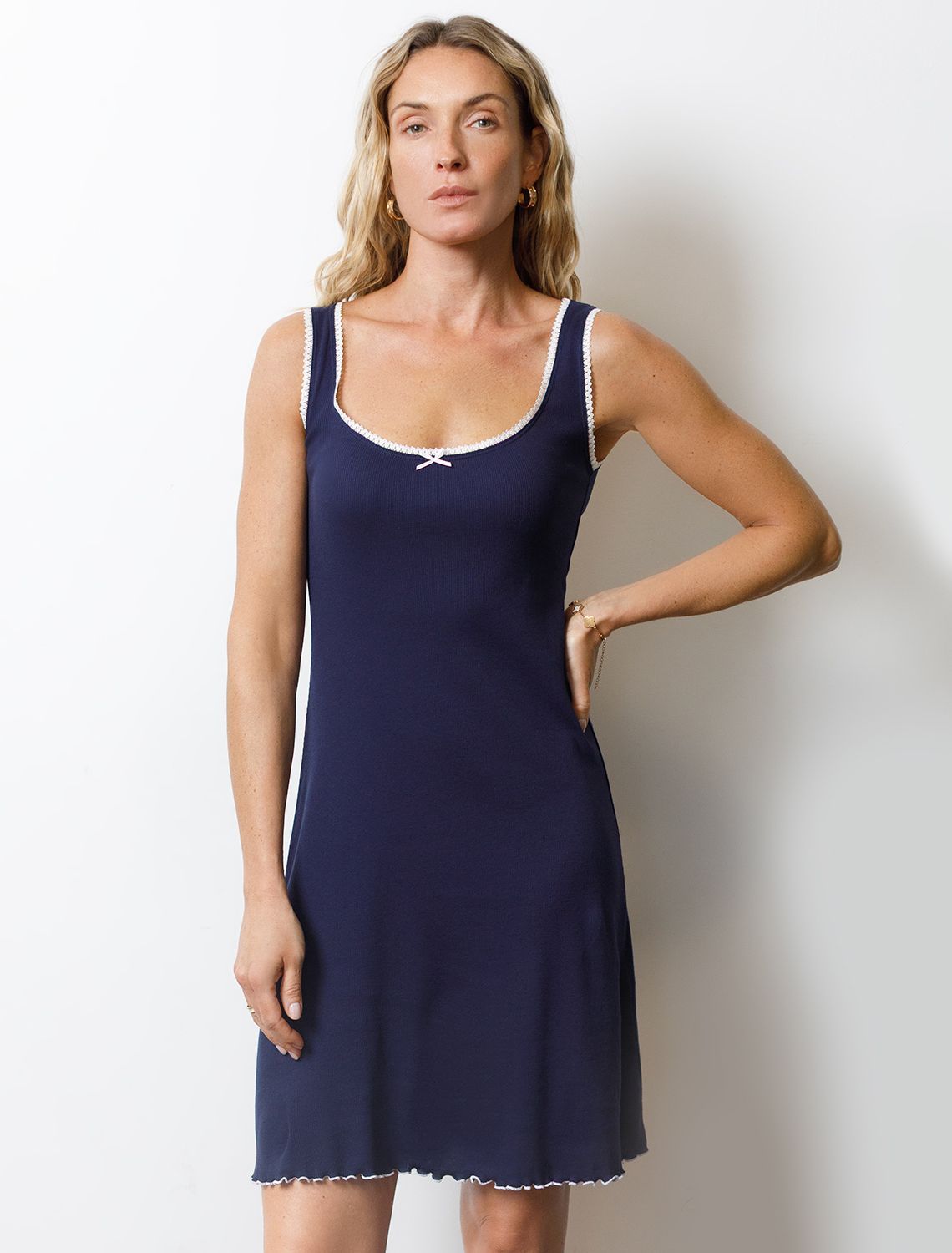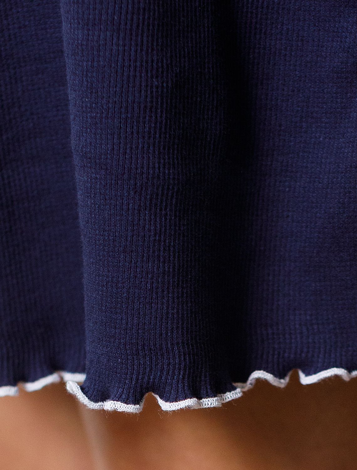 Сарафан темно-синего цвета длины мини с U вырезом из фактурного трикотажа в рубчик создан для современных женщин, ценящих красоту и удобство. Особенность полотна - трикотаж кашкорсе удивительной мягкости, намного мягче стандартных вариантов, подходящий для расслабленных домашних и пижамных образов. Хлопок обеспечивает максимальный комфорт даже в течение длительного времени и позволяет коже дышать, а эластан в составе позволяет ткани подстраиваться под особенности фигуры. Крой выгодно подчеркивает фигуру и создает женственное настроение в образе. Благодаря отделке нежным кружевом сарафан выглядит по-особенному романтично и изысканно. Этот домашний сарафан подойдет для спокойного вечера в кругу семьи, а так же для отдыха и сна. Легкий аккуратный волан по низу придает платью на широких лямках интересный акцент. Такой милый сарафан идеально смотрится на разных типах фигуры благодаря представленной широкой размерной линейке. Универсальное хлопковое платье гармонично впишется в гардероб, подчеркнет индивидуальность и создаст хорошее настроение дома.
