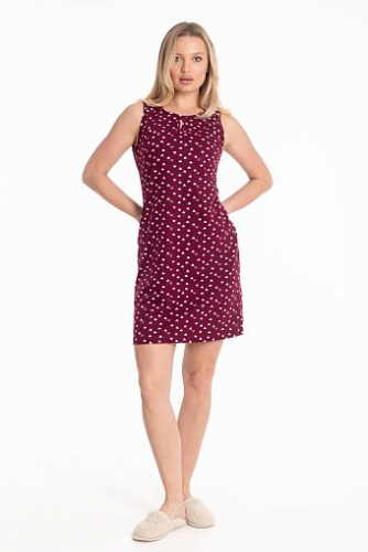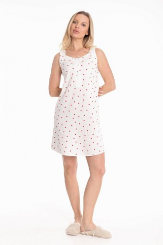 Женская сорочка выполнена из хлопкового полотна с набивным рисунком. Срезы пройм, низ изделия, горловина и кокетки аккуратно обработаны бейкой. Спереди предусмотрена застёжка на пуговицах и небольшой декоративный бантик, который придаёт модели нежный и женственный акцент.