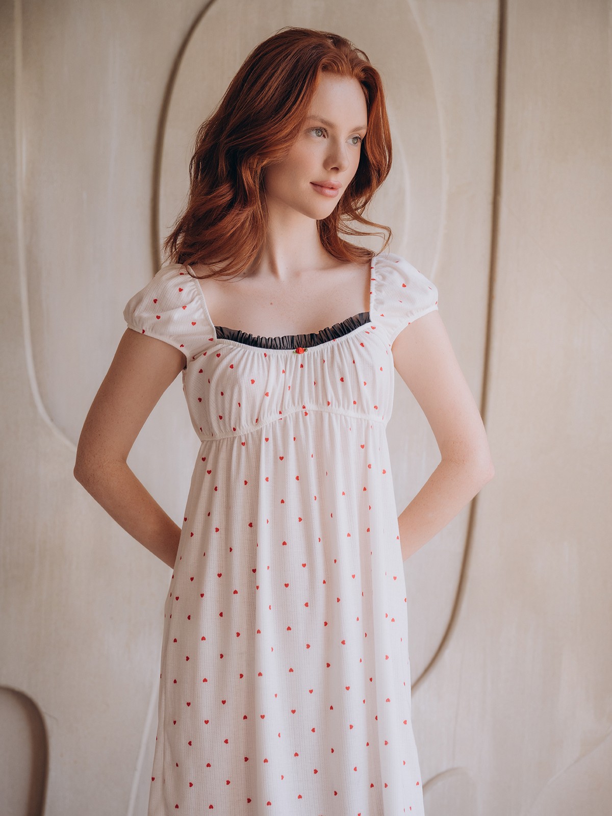Сорочка выполнена в белом цвете с нанесённым принтом с изображением сердечек.