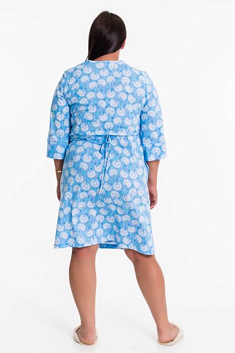 Халат выполнен из хлопкового полотна. Рукава длиной 3/4, полочки запахиваются и завязываются на пояс. По бокам есть карманы.
