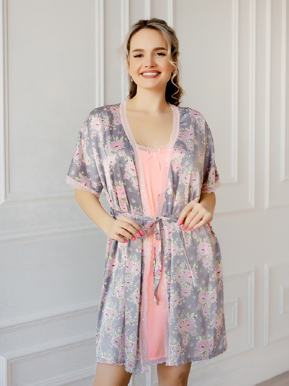Шелковый изысканный домашний пеньюар для женщин. Комплект состоит из сорочки и халата. Халат с набивным рисунком, запашной, длинной до колена с застежкой на полудержатель и пояс. Рукава и горловина халата декорированы эластичным кружевом. Сорочка из однотонного шелка, полуприлегающего силуэта, длинною до колена, на тонких регулируемых бретелях. Горловина полочки и низ сорочки оформлен кружевом в цвет изделия.