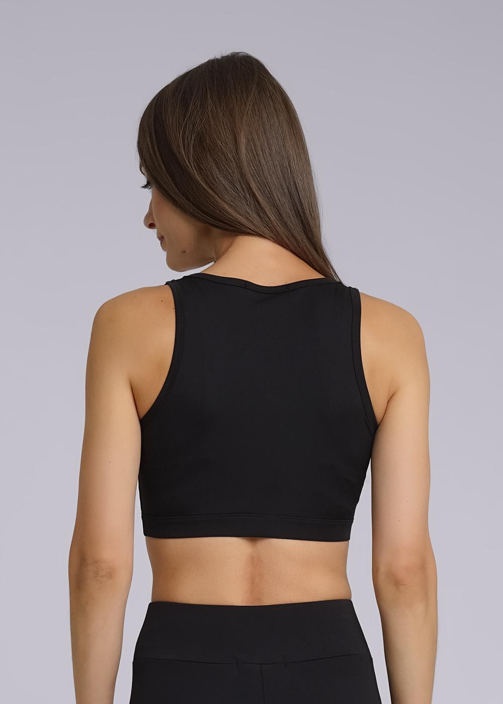 Майка укорченная спортивная из эластичного плотного полотна. Широкая бретель. Круглый вырез горловины. Двойной перед с принтом пленкой.