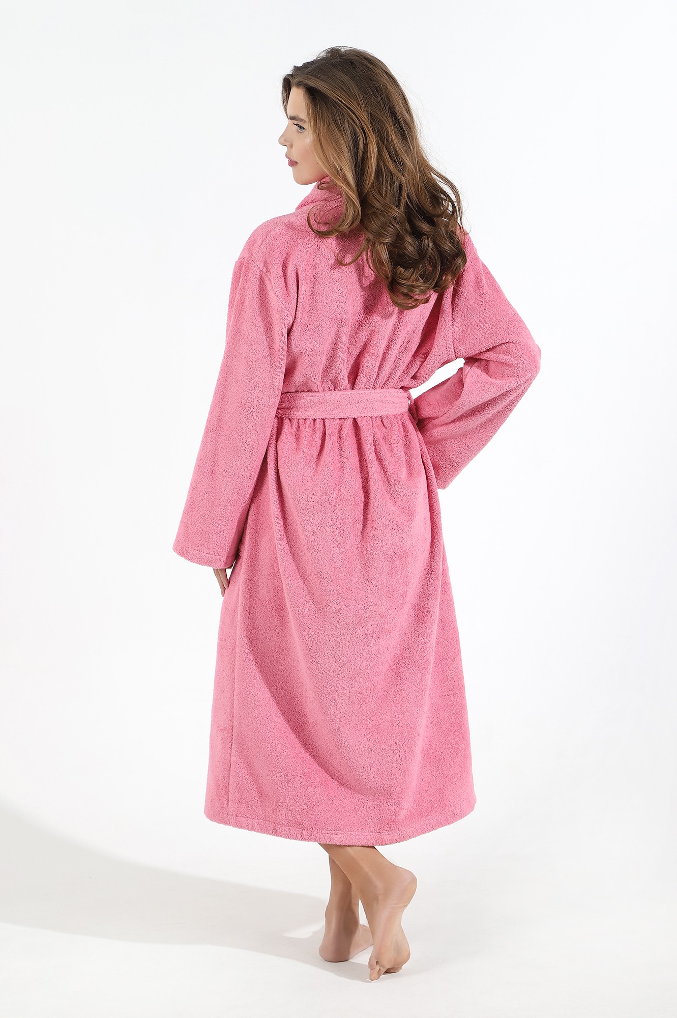 Женский халат из двустороннего махрового хлопкового полотна. Модель на запах, с поясом в шлёвках, с боковыми карманами, с воротником "шаль", с петлей-вешалкой по горловине спинки.