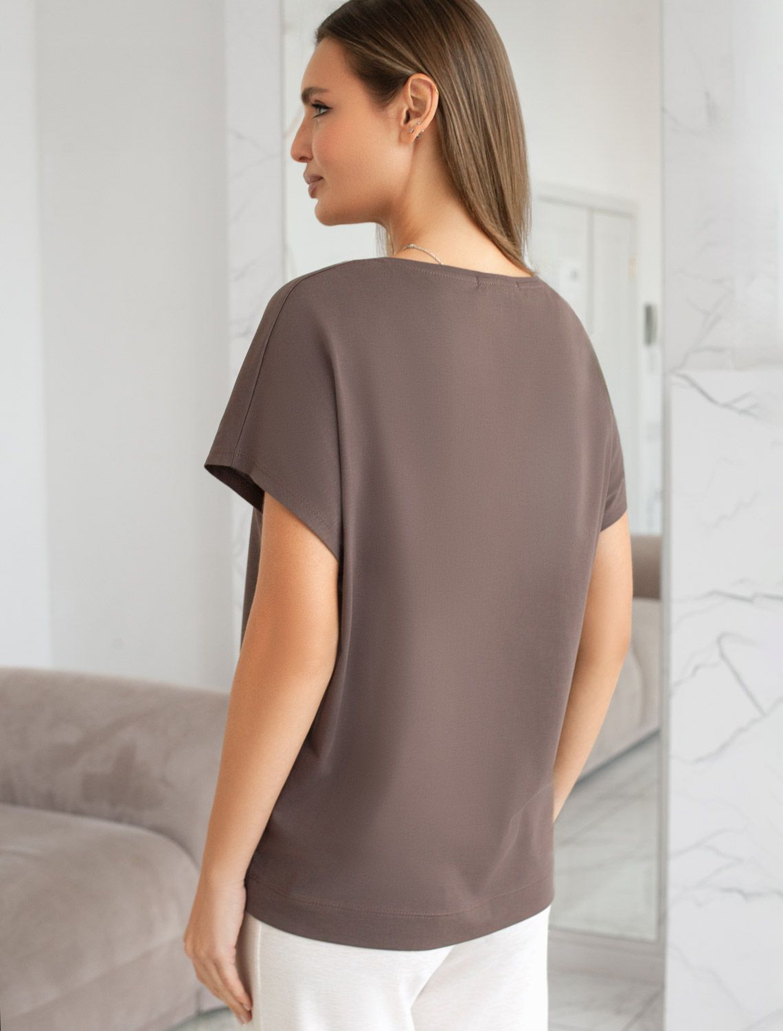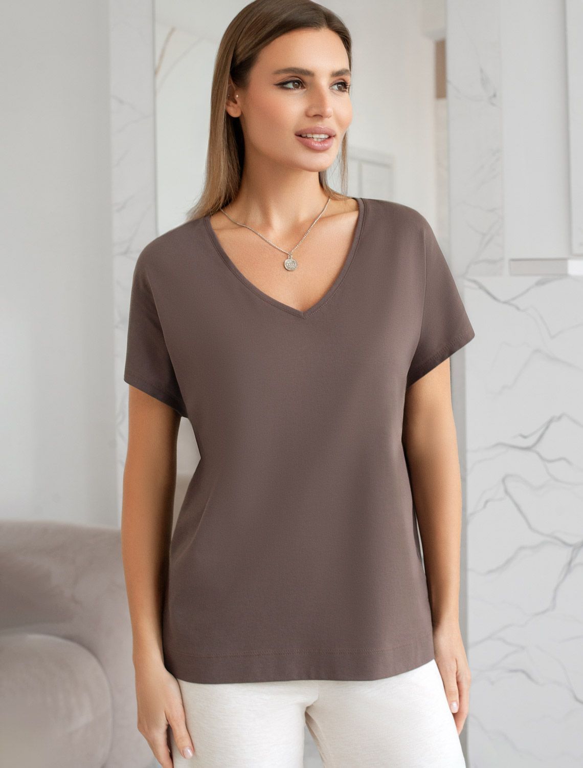 Свободная футболка кофейного цвета с V-вырезом и цельнокроеным рукавом выполнена из натурального 100% хлопка. Главная особенность этого изделия — тонкое кулирное полотно, которое легче и воздушнее стандартного варианта. Благодаря своей деликатной текстуре футболка идеально подходит для домашних образов и пижамных комплектов. Ткань отлично дышит, обеспечивая максимальный уют во время сна и отдыха. V-вырез утонченно подчеркивает линию шеи, а свободный крой скрывает возможные недостатки фигуры. Такая оверсайз футболка отлично подойдет на большие размкры и для тех, кто ценит комфорт и стиль одновременно. Эта футболка женственно смотрится и дарит ощущение уюта, делая ее необходимым элементом домашнего гардероба.