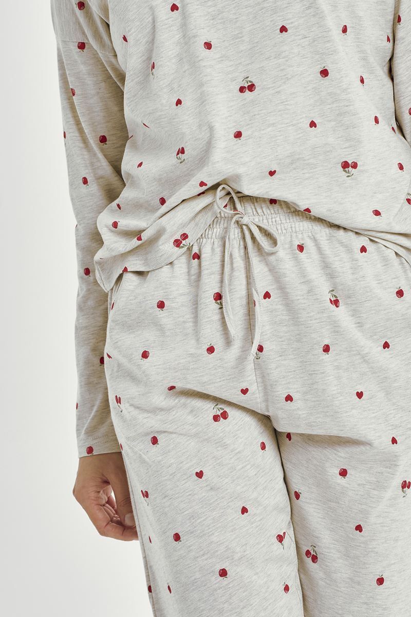 Женская пижама из натурального хлопка с вишневым принтом. Состоит из футболки с длинным рукавом и круглым вырезом, а также длинных брюк с удобным шнурком на талии и вместительными карманами на бедрах. 98% хлопок/ 2% полиэстер