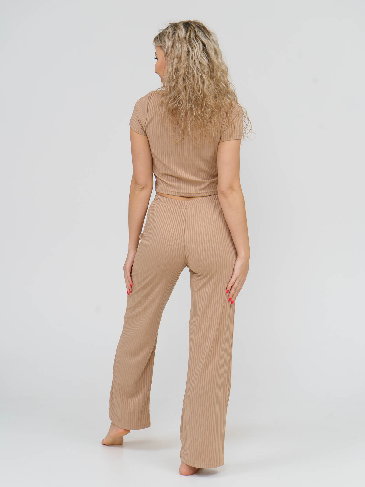 Домашний женский костюм из ткани "лапша" в мелкий рубчик подарит чувство комфорта, идеальная посадка не сковывает движения, выглядит стильно. Укороченная футболка полуприлегающего силуэта с коротким рукавом и свободные брюки в высокой посадкой - идеальный комплект для уютного вечера дома.