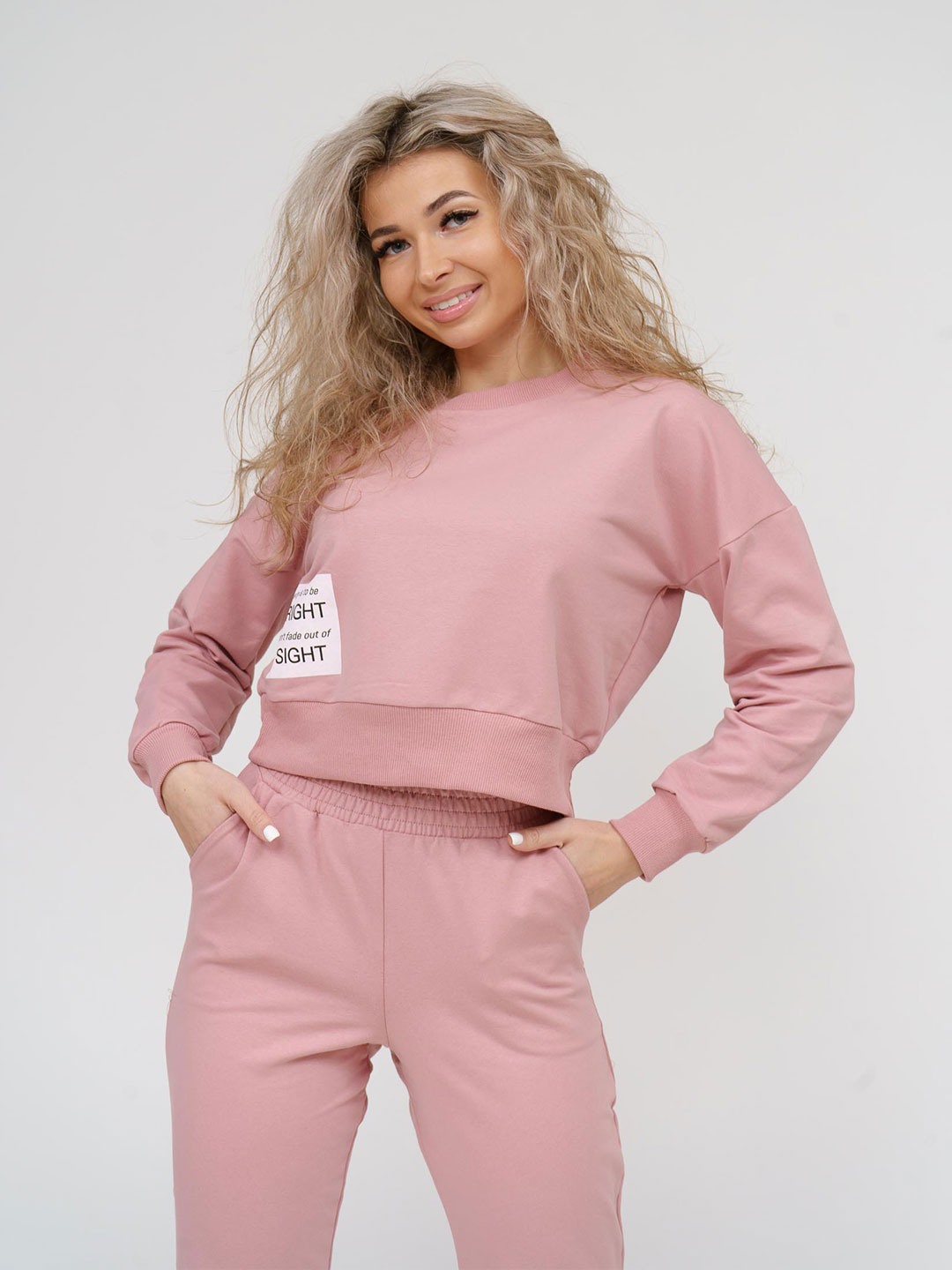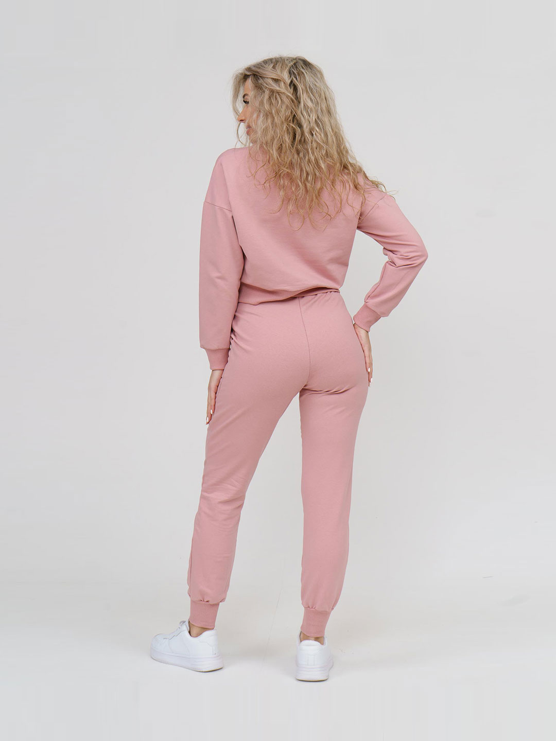 Костюм молодёжный полуприлегающего силуэта. Кофта со спущеным плечевым поясом укороченная. Рукав длинный на манжете. По низу изделия пояс. Брюки на манжете. На передних половинках присутствует карман в отрезном бочке. Верхний срез брюк обрабатывается поясом на резинке. Вырез горловины О-образный, обработанный планкой.