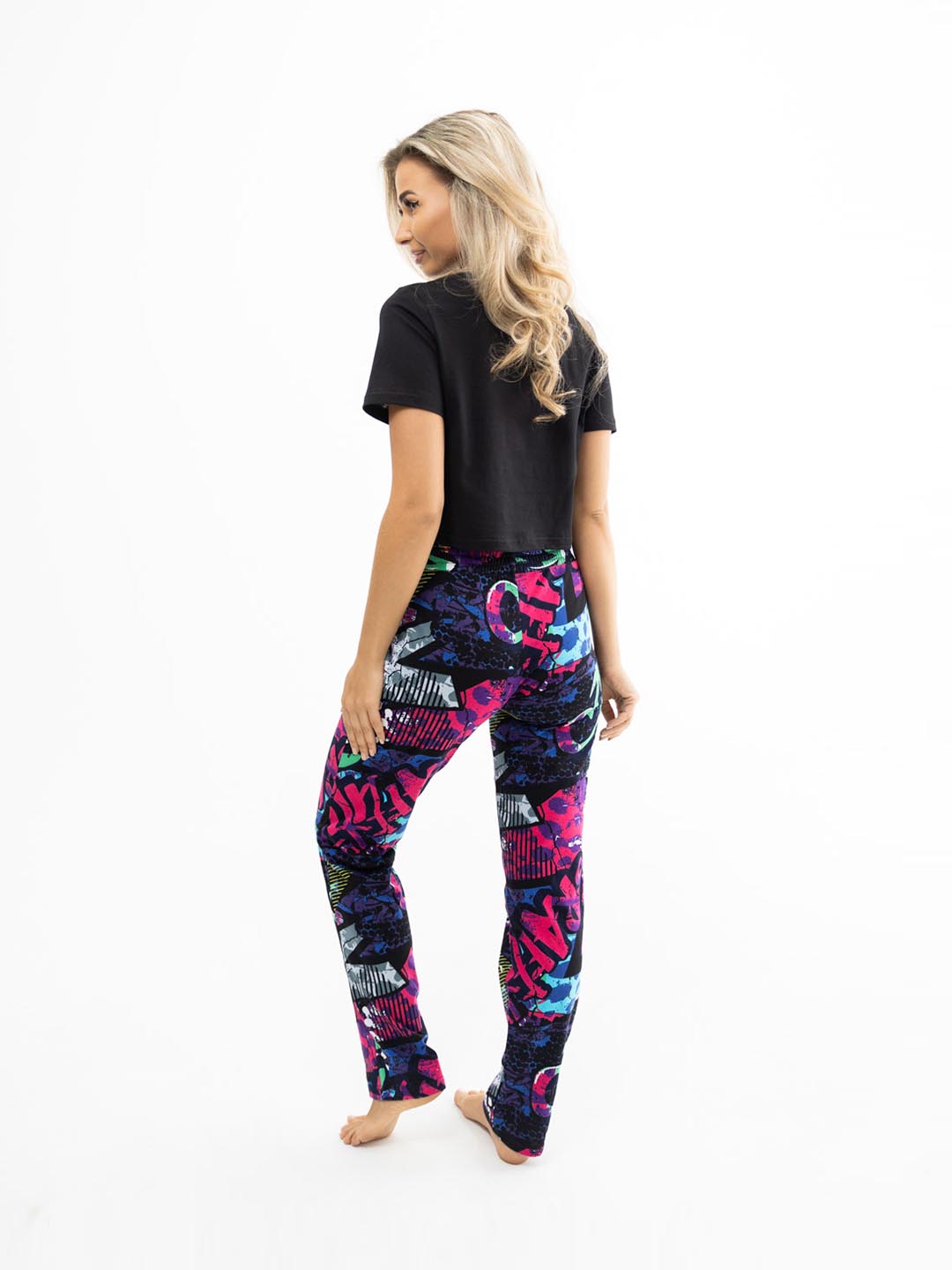 Костюм из 100% хлопка, с яркими брюками и укороченной футболкой, со стильной печатью спереди. Турецкая кулирка - обладает отменным качеством, принт на ней яркий и насыщенный. Печать выполнена профессиональной краской, за счет чего будет радовать Вас долгое время. Отличтельной особенностью данной модели является яркий молодежный дизайн стритстайл.