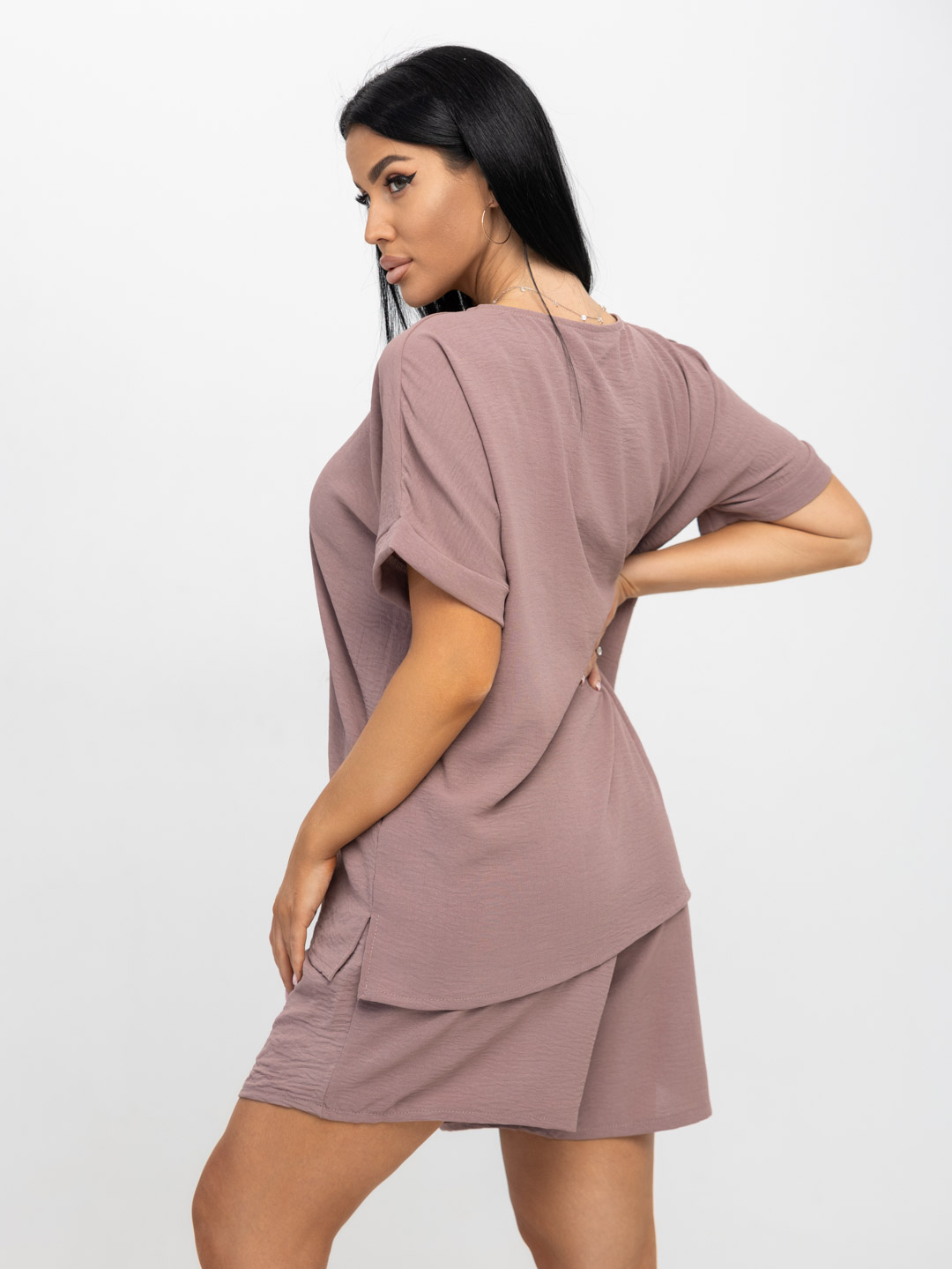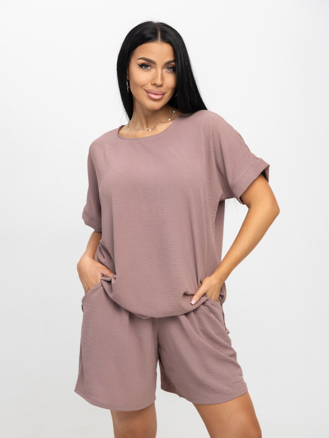 Костюм женский, состоящий из блузы свободного кроя со спущенным рукавом и шорт. Шорты с удобной посадкой на резинке и карманами обеспечат полную свободу движений. Сочетание легкой и дышащей ткани с непринужденным кроем создает ощущение прохлады и свежести даже в самые жаркие дни. Ткань не мнется и быстро сохнет, что делает этот костюм идеальным для путешествий или активного отдыха.