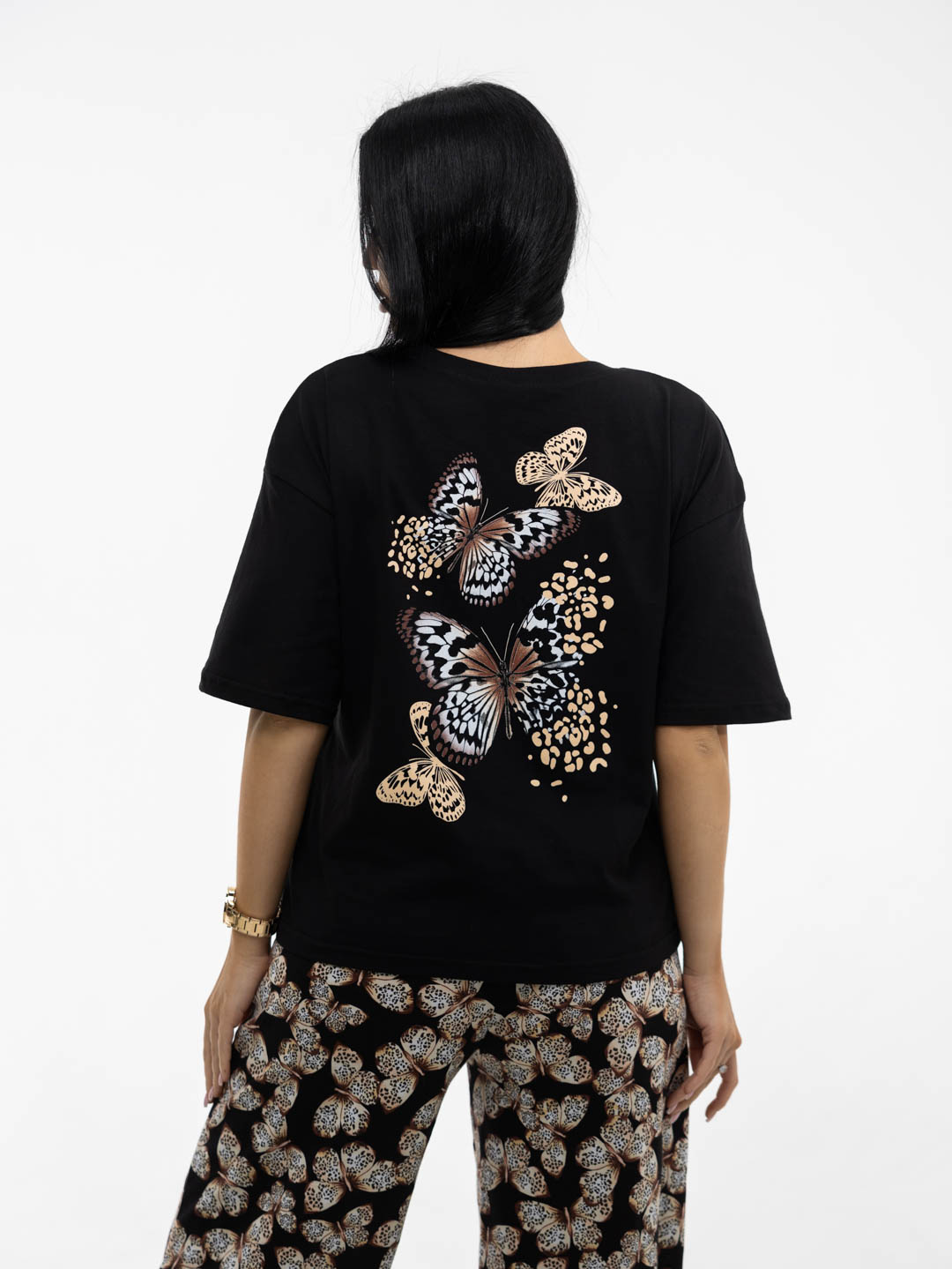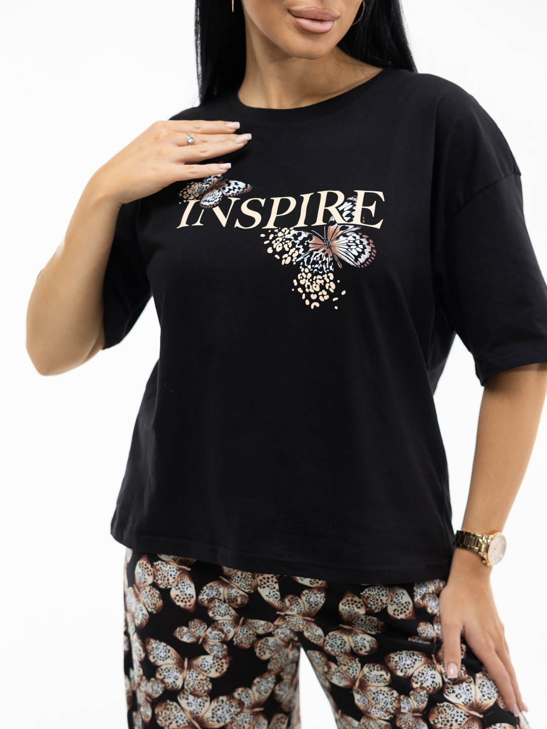 Базовый комплект с широкими штанами и крутой футболкой со спущенной линией плеча и двумя стильными печатями. Брюки выполнены из ткани с рисунком, в боковых швах карманы, на поясе декоративный атласный бантик. Принт на футболке идеально подобран к штанам. Элегантный брючный костюм позволит вам ощутить себя настоящей иконой стиля. Закажите свой уникальный пижамный костюм прямо сейчас и подчеркните свою индивидуальность.
