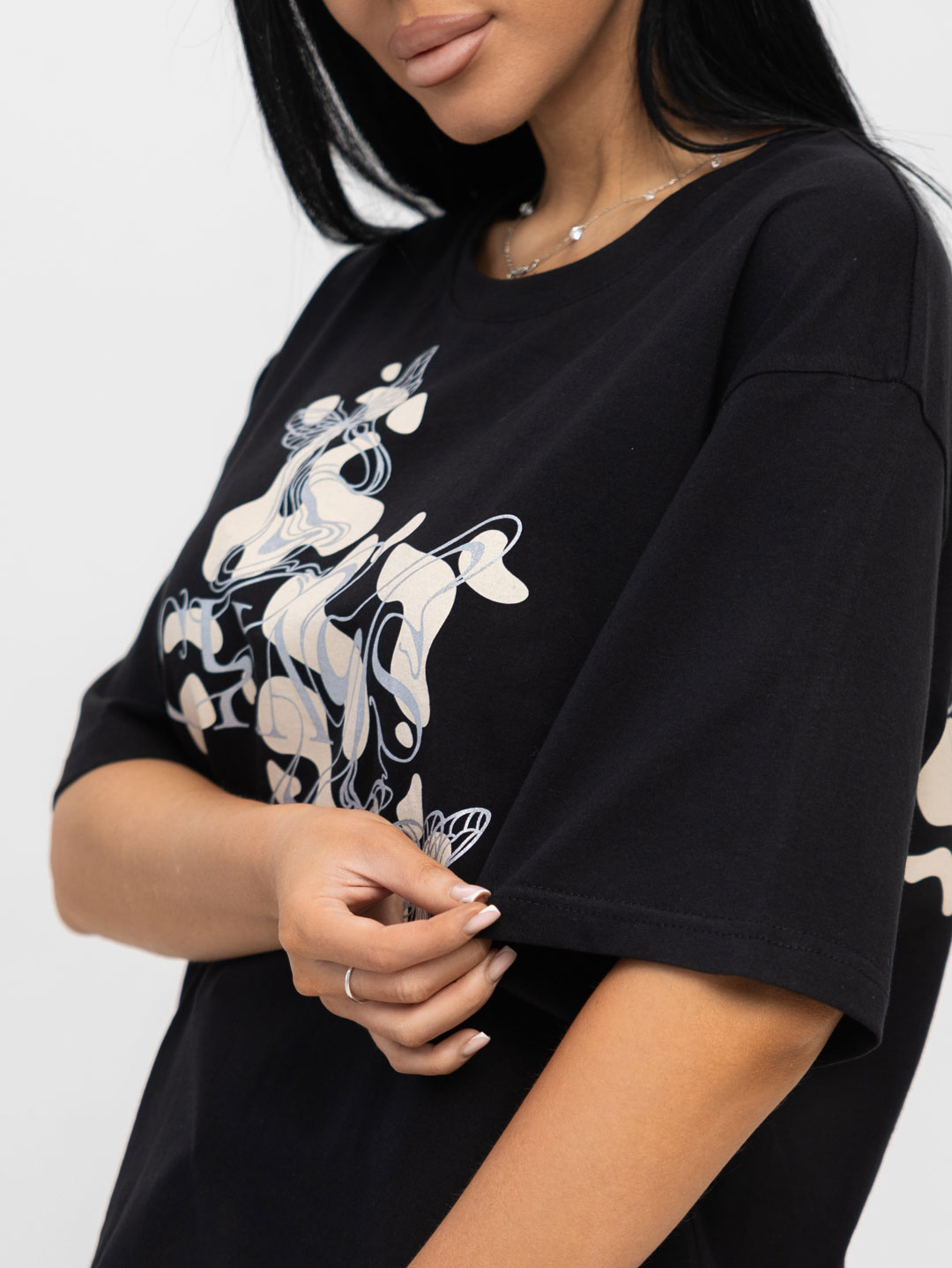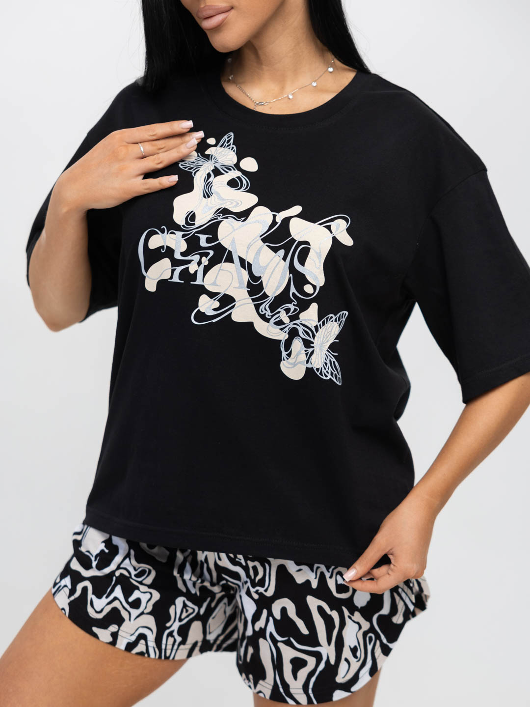 Костюм женский шорты и футболка. Футболка со спущенным коротким рукавом и округлой горловиной. На полочке и спинке печатный рисунок. Шорты - короткие, свободного силуэта, с поясом на резинке и вырезом в области бокового шва, для идеальной посадки и максимального комфорта.