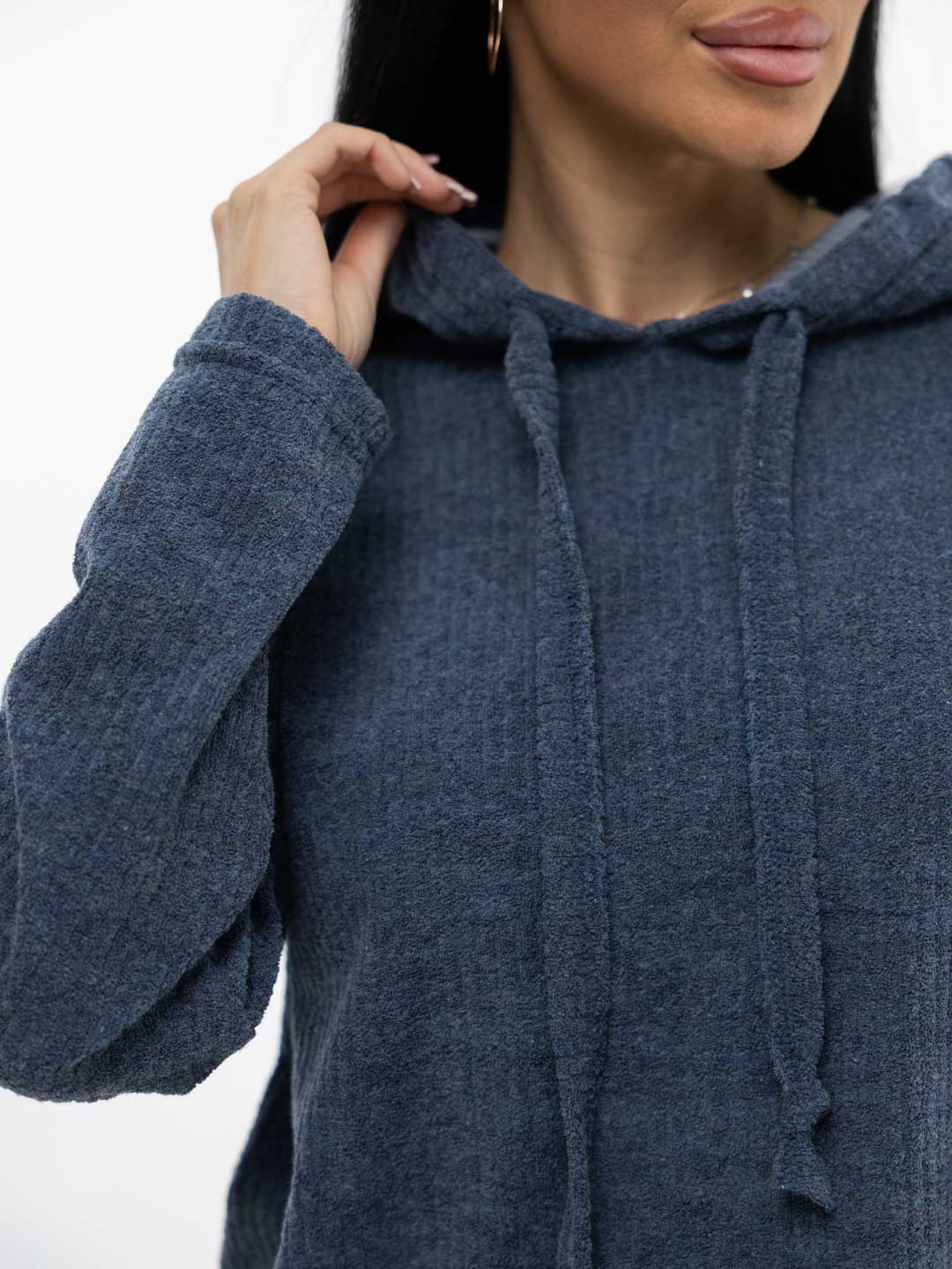 Худи с капюшоном, длинным рукавом и шнурком из основного материала. Широкие брюки с накладными карманами.