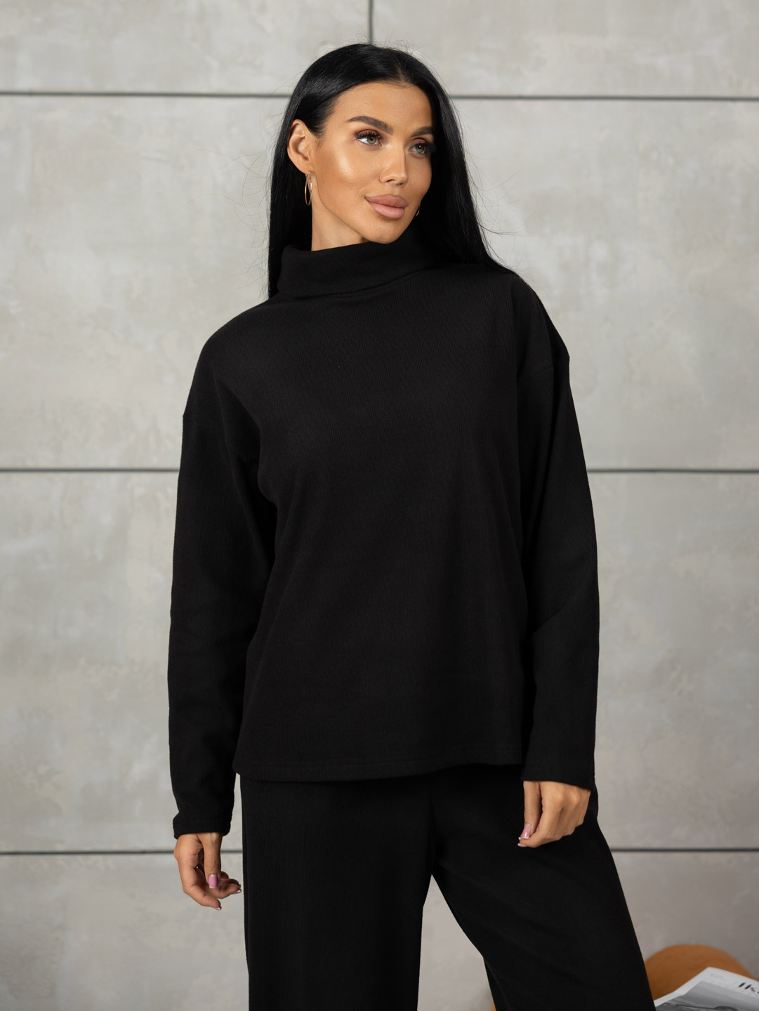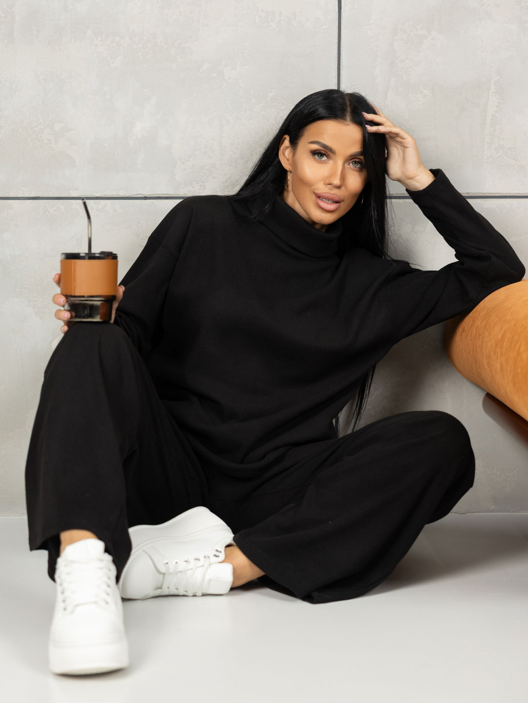 Костюм женский кашемировый свободного силуэта. Верх с длинным рукавом и воротником - стойкой. Брюки - шаровары с поясом на резинке и удобными карманами с отрезным бочком.
