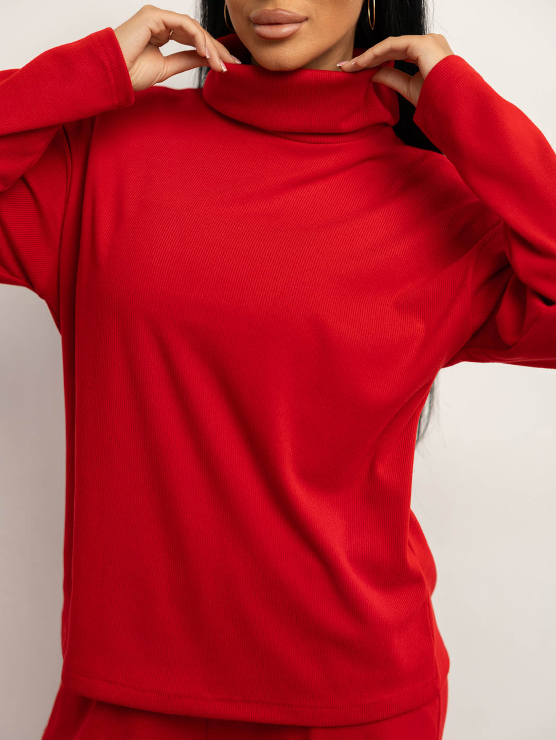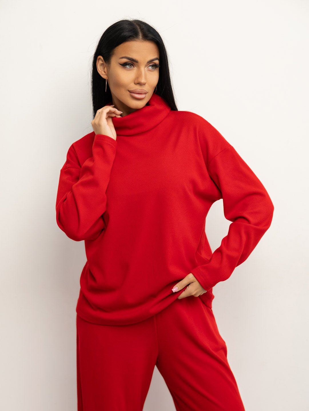 Костюм женский кашемировый свободного силуэта. Верх с длинным рукавом и воротником - стойкой. Брюки - шаровары с поясом на резинке и удобными карманами с отрезным бочком.