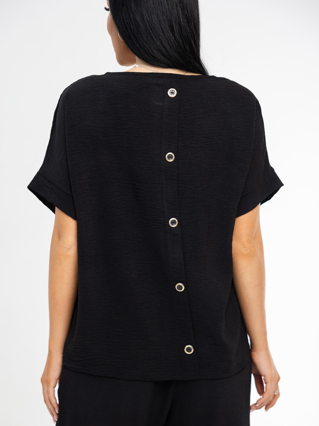 Костюм женский свободного силуэта, состоящий из футболки с коротким рукавом и брюк модели - шаровары. Верх с округлым вырезом горловины и целькроеным рукавом с манжетой. На спинке деокративная застежка на пуговицы. Брюки с широким поясом на резинке, для надежной фиксации на уровне талии и повышенного комфорта при носке, а так же удобными карманами с отрезным бочком. Элегантная летняя модель для повседневной носки.