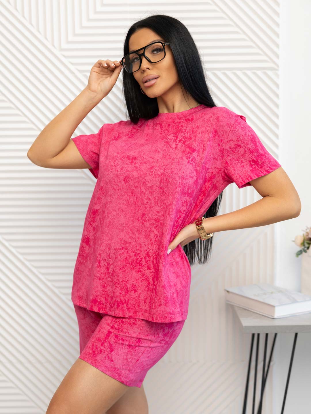 Костюм женский свободного силуэта, футболка и шорты. Футболка с коротким спущенным рукавом и округлой горловиной. Шорты с поясом на резинке.Яркий современный рисунок ткани в стиле - варенка. Легкий, удобный костюм из натурального хлопка, на каждый день.