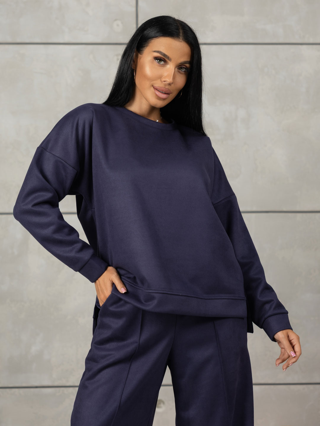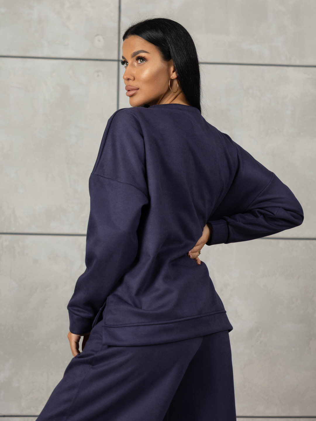 Костюм женский свободного силуэта. Свитшот с длинным спущенным рукавом, округлым вырезом и ассиметричным низом. Рукава и низ кофты на манжетах. Брюки - шаровары с удобным поясом на резинке и карманами с отрезным бочком.