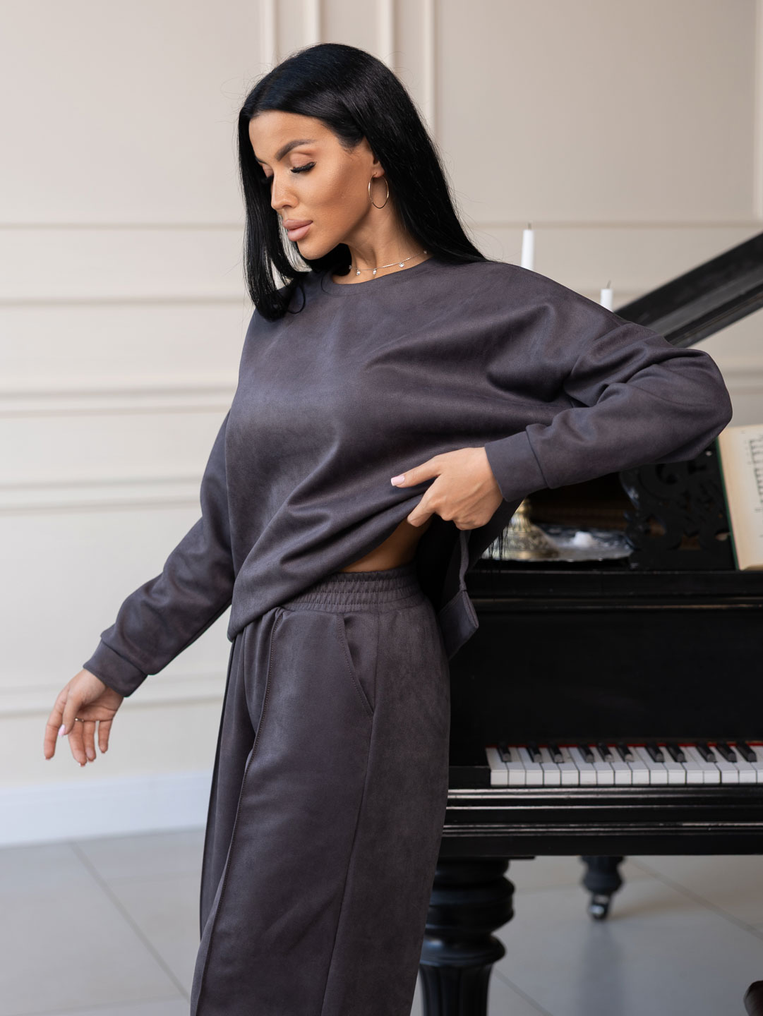 Костюм женский свободного силуэта. Свитшот с длинным спущенным рукавом, округлым вырезом и ассиметричным низом. Рукава и низ кофты на манжетах. Брюки - шаровары с удобным поясом на резинке и карманами с отрезным бочком.