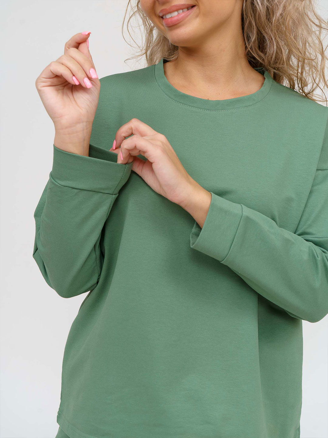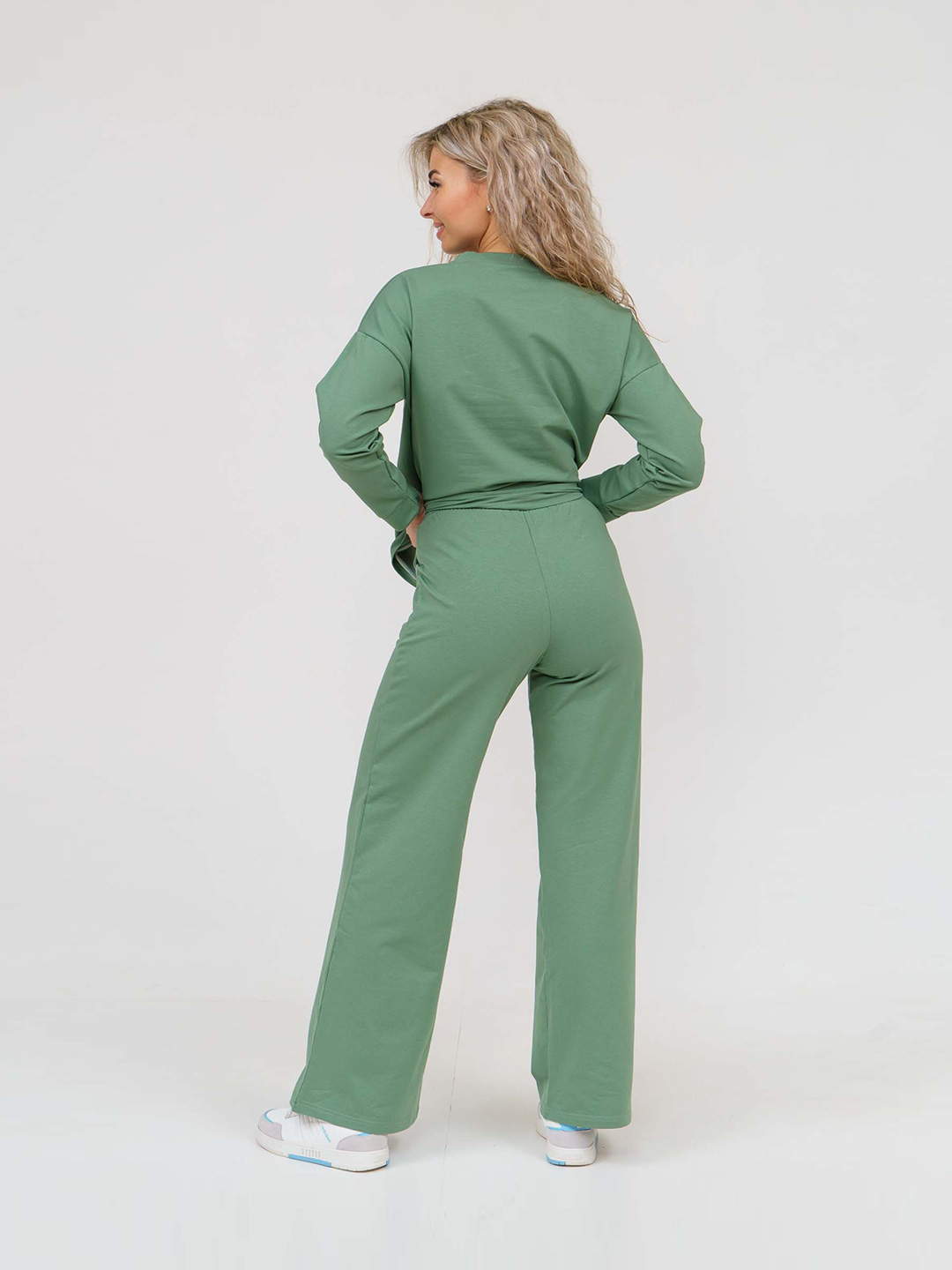 Молодежный костюм из футера. Толстовка "oversize" со спущенной линией плеча, длинным рукавом с манжетой и О-образной горловиной. Широкие брюки на резинке с высокой посадкой, боковые карманы с отрезным бочком. Материал — футер без начеса, идеальный вариант на весну и лето.