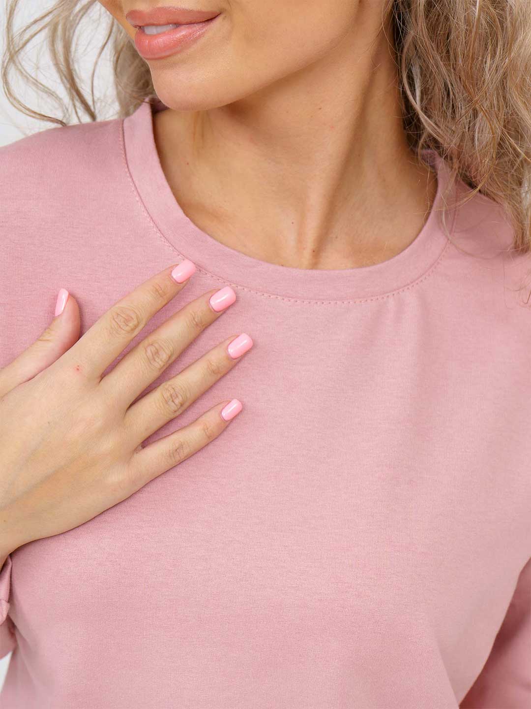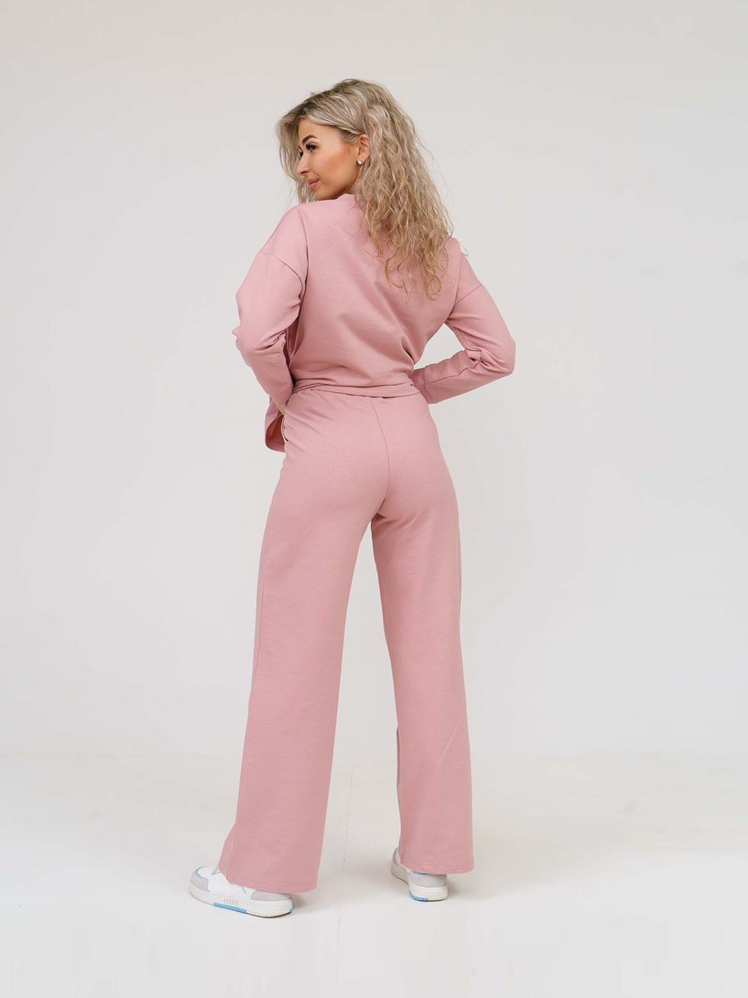 Молодежный костюм из футера. Толстовка "oversize" со спущенной линией плеча, длинным рукавом с манжетой и О-образной горловиной. Широкие брюки на резинке с высокой посадкой, боковые карманы с отрезным бочком. Материал — футер без начеса, идеальный вариант на весну и лето.