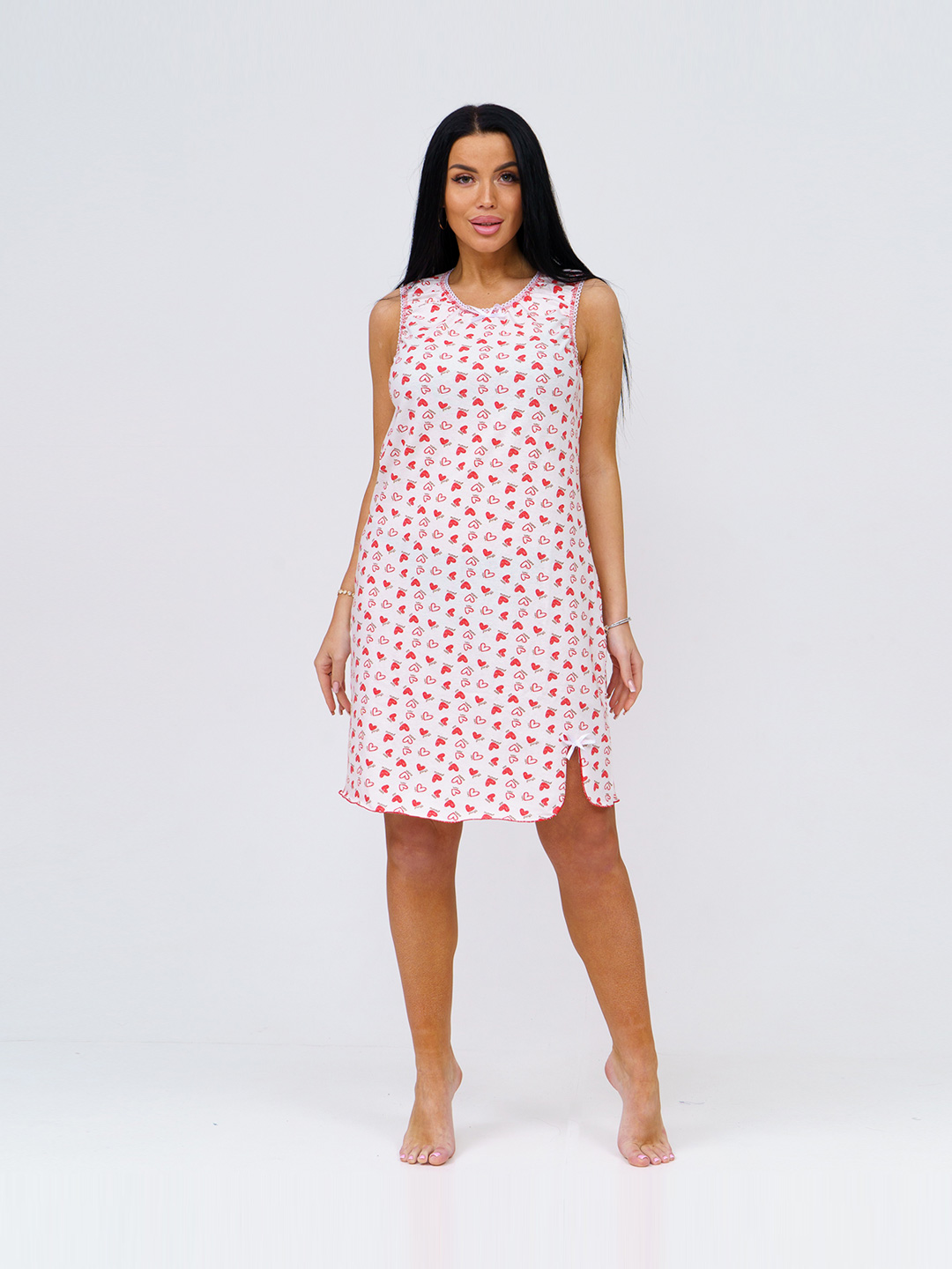 Ночная сорочка полуприлегающего силуэта из трикотажного полотна длиной выше колена. Вырез горловины О-образный, горловина и пройма обработаны декоративной резинкой.