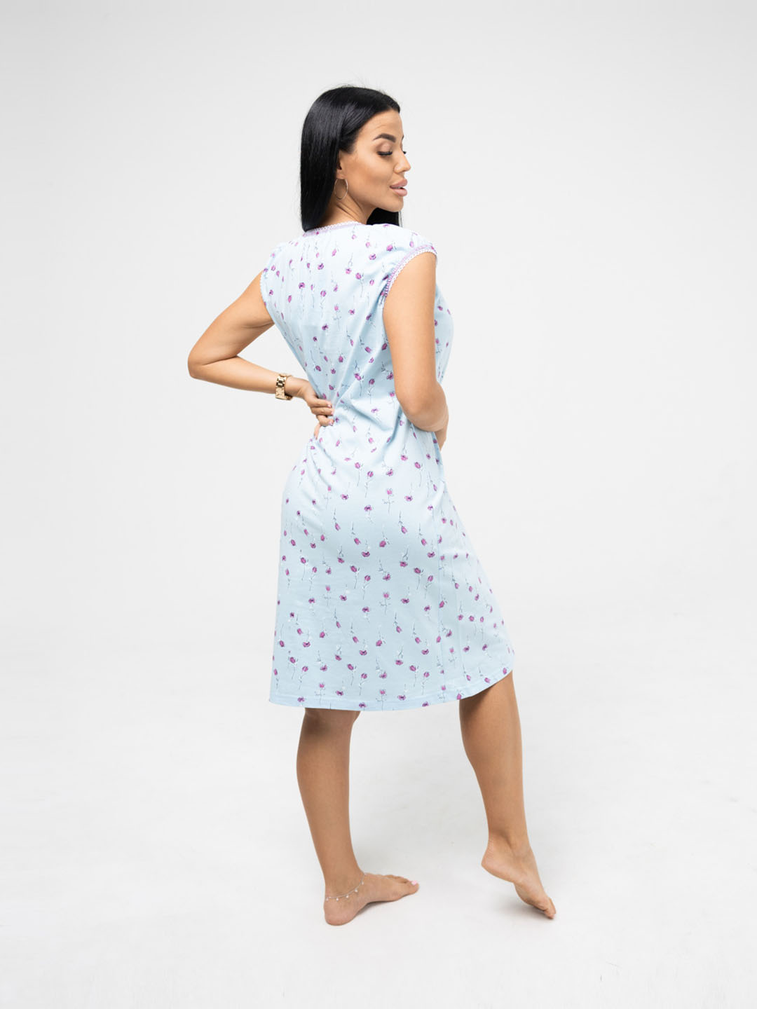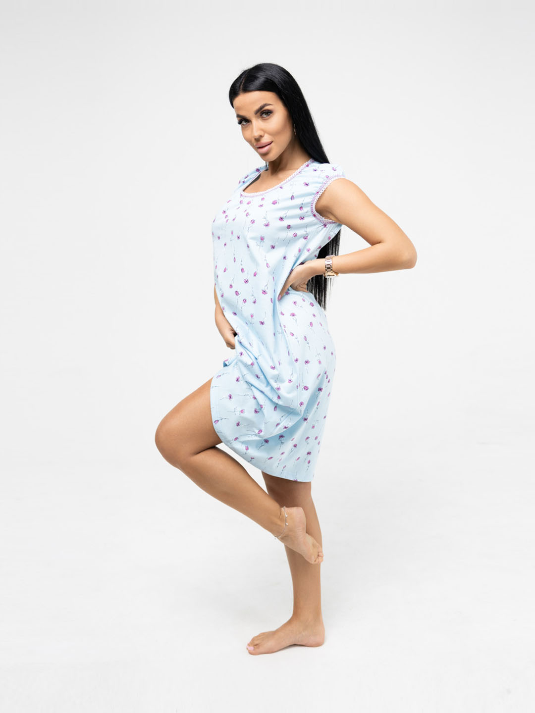 Ночная сорочка женская выполнена из хлопкового материала. Сорочка длиной ниже колена. Вырез горловины О-образный.