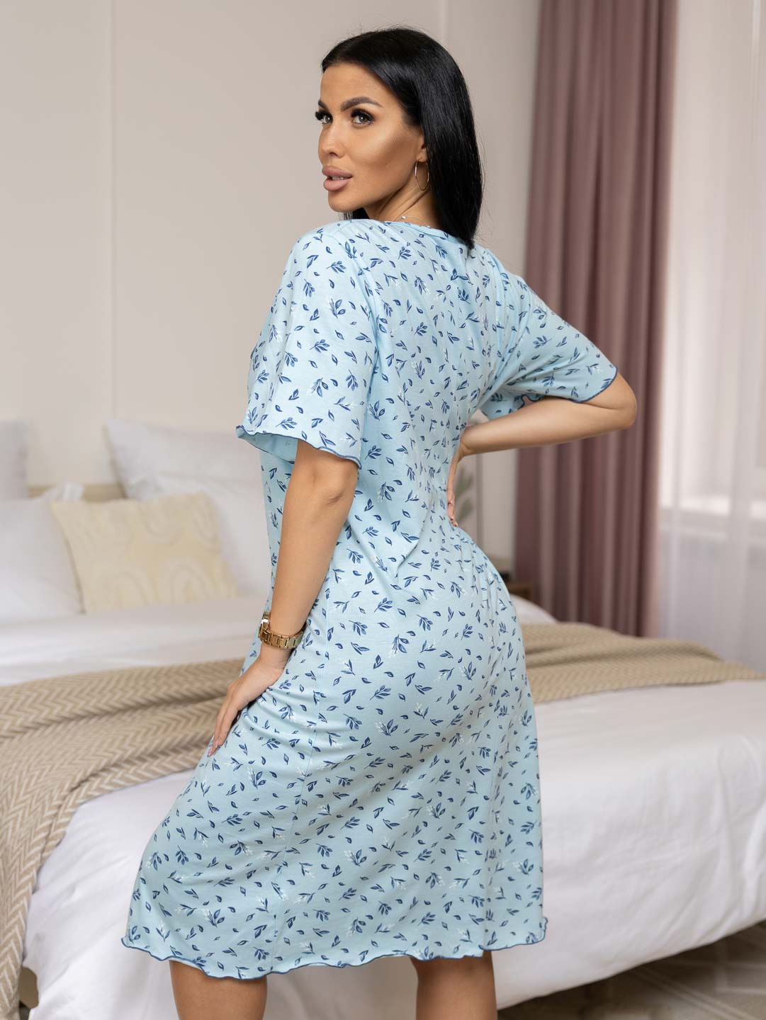 Ночная женская сорочка из хлопка длиной ниже колена, свободной силуэтной формы с коротким рукавом. Спереди кокетка с рюшем. В нашей сорочке Вы будете чувствовать себя комфортно во время сна.