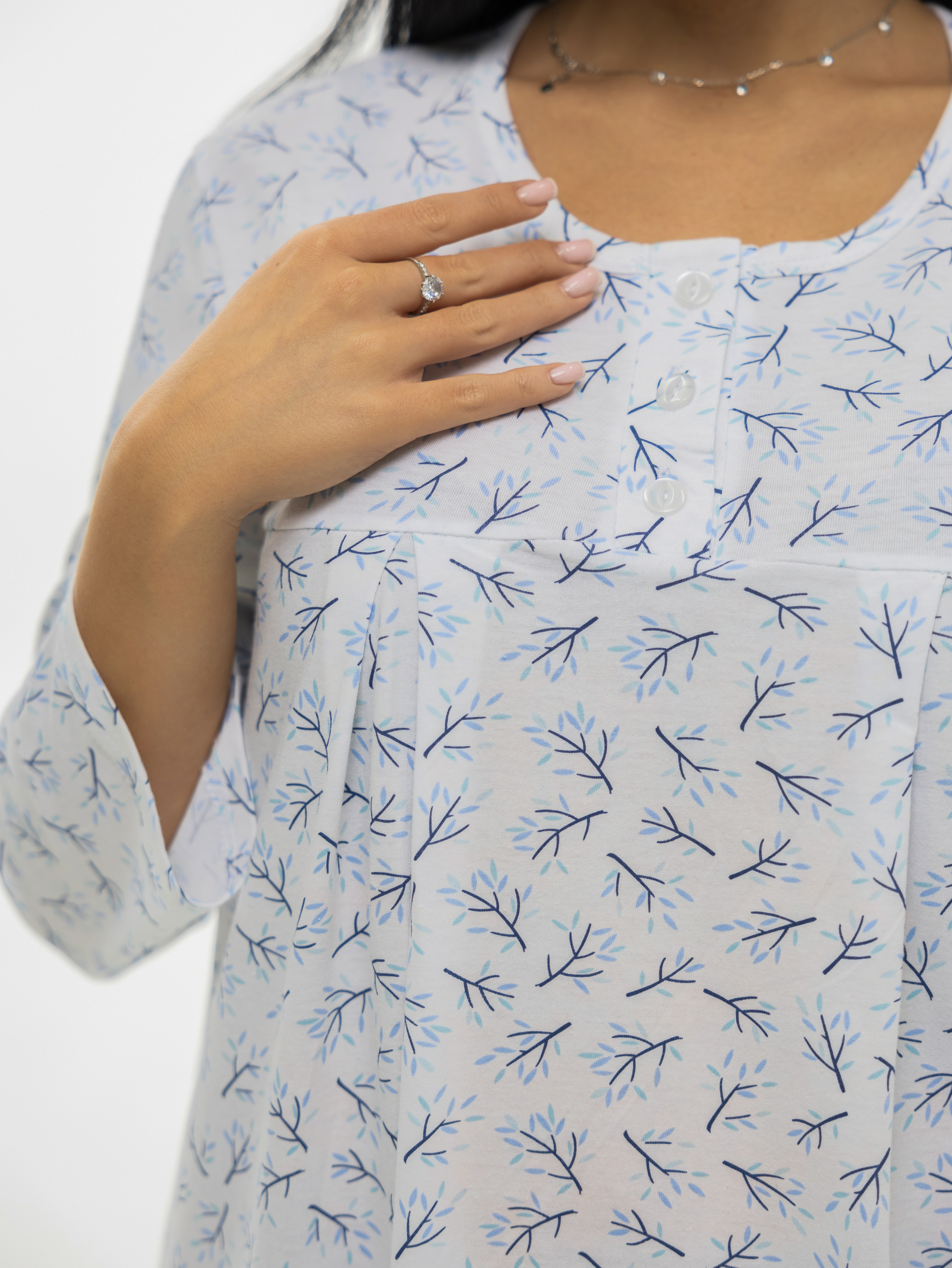 Ночная женская сорочка из кулирки, свободного силуэта, длиной ниже колена. Вырез горловины О-образный.