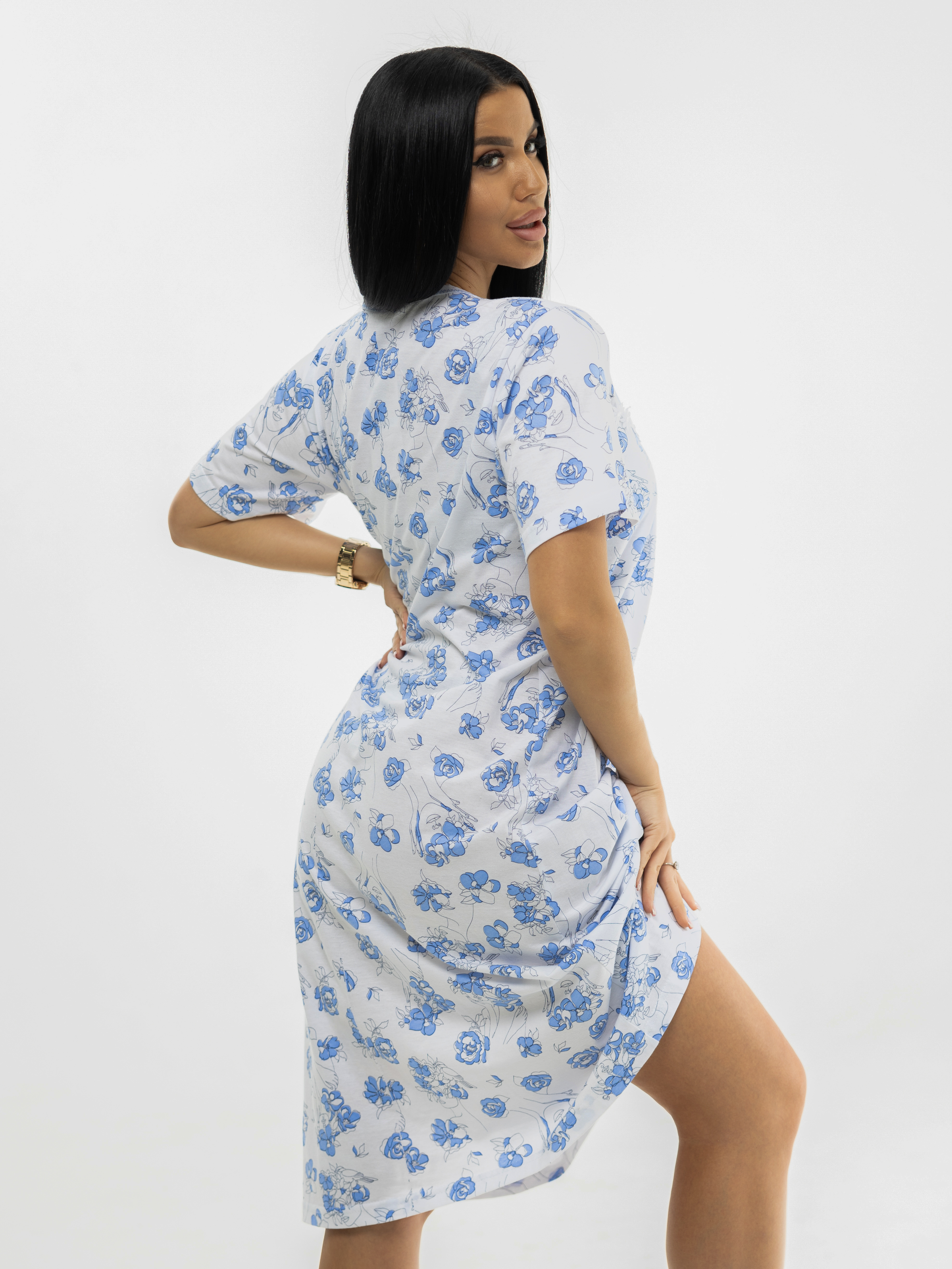 Ночная сорочка женская из трикотажного полотна - кулирка, прямого силуэта, с притачной кокеткой по верху переда, со складками по линии соединения кокетки и полочки, поверх шва соединения кокетки и полочки нашита декоративная тесьма с ромашками. Вырез горловины О-образный и обработан окантовкой. Рукав втачной, базового покроя, короткий.