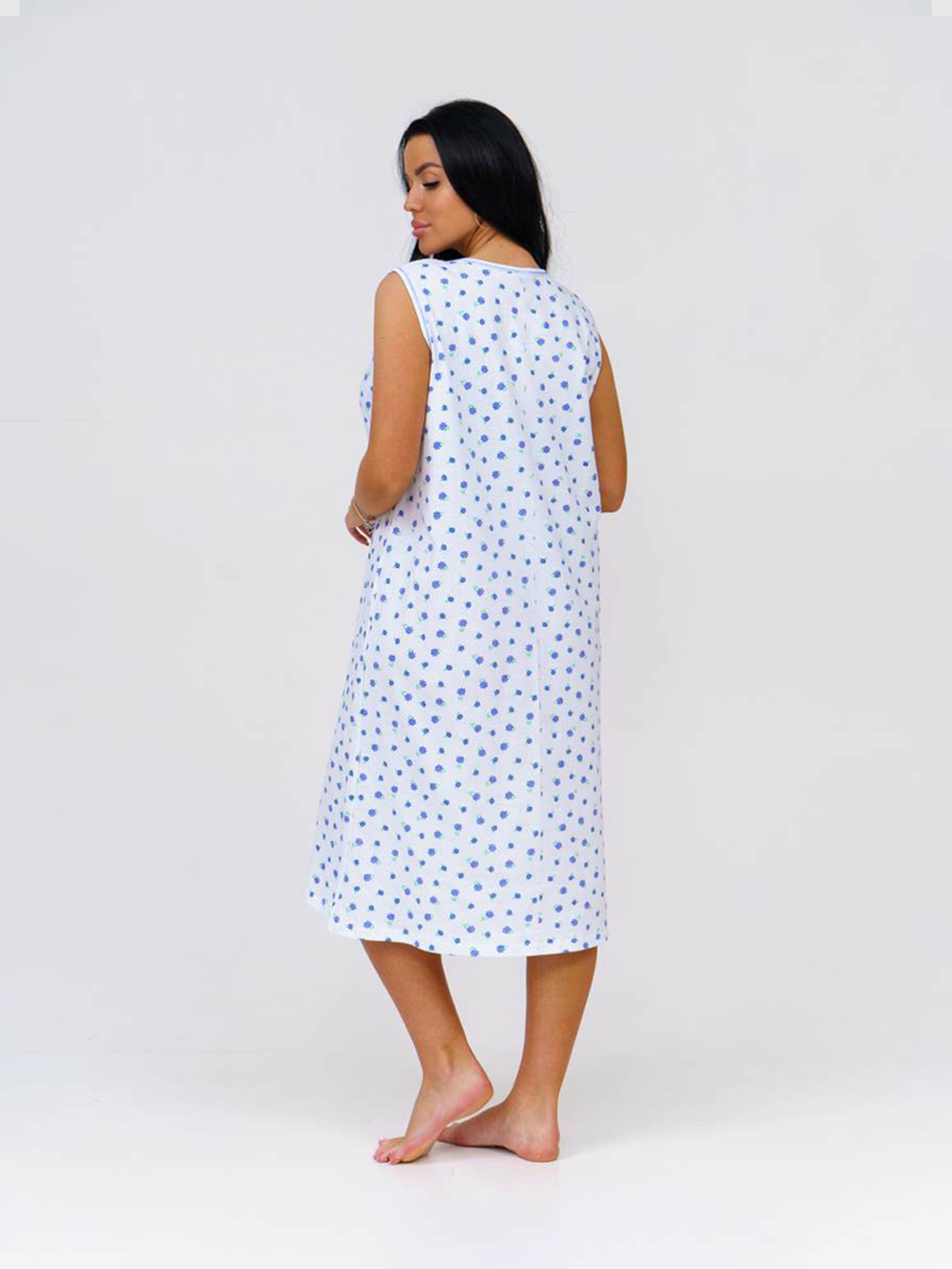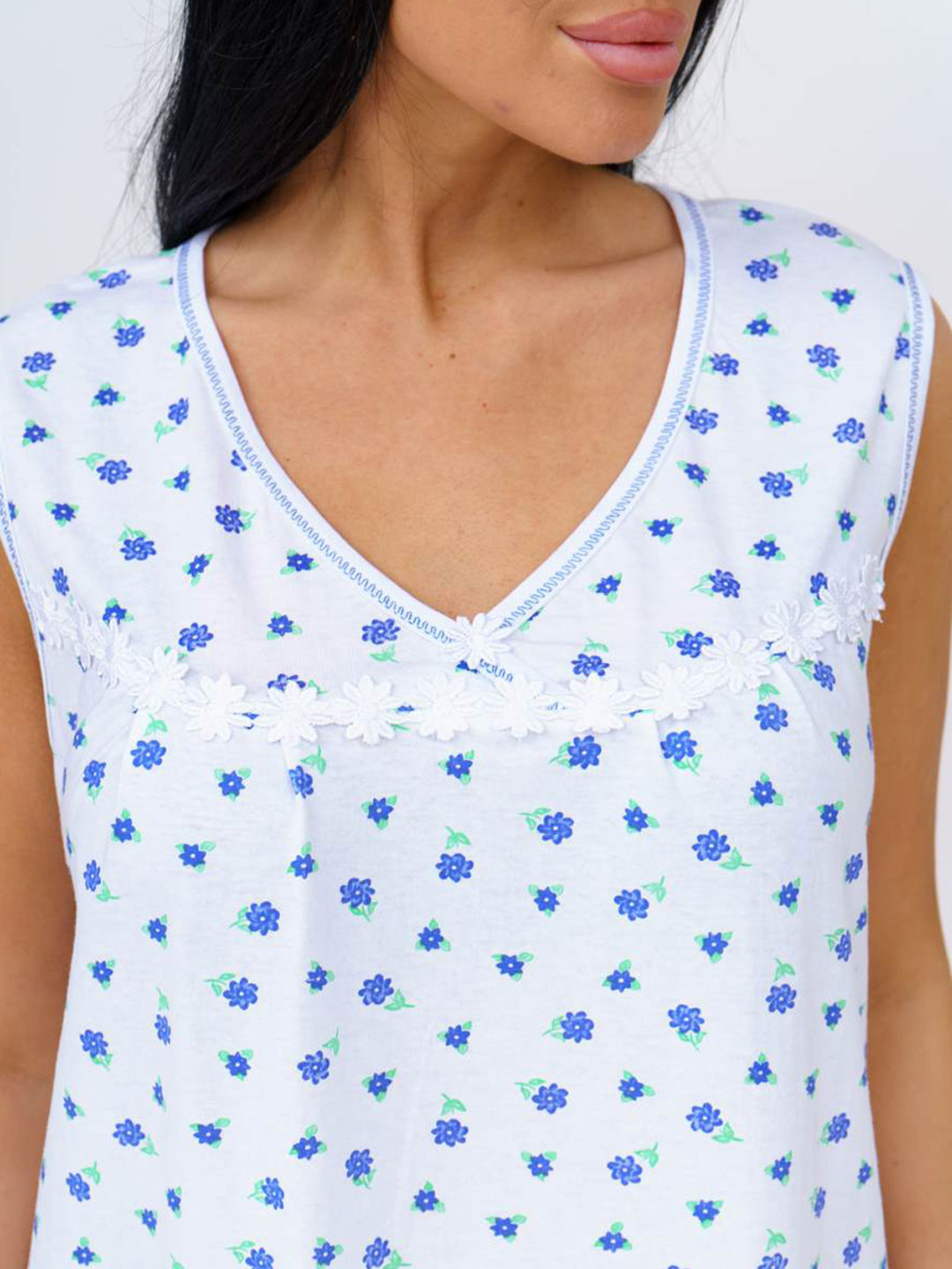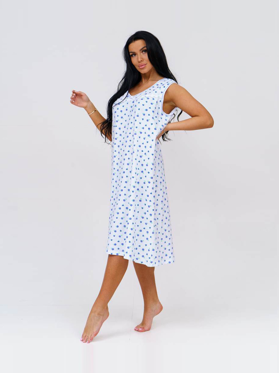 Ночная женская сорочка из хлопка, свободного силуэта, длиной ниже колена. Спереди кокетка отделанная шитьем, вырез горловины V-образный.