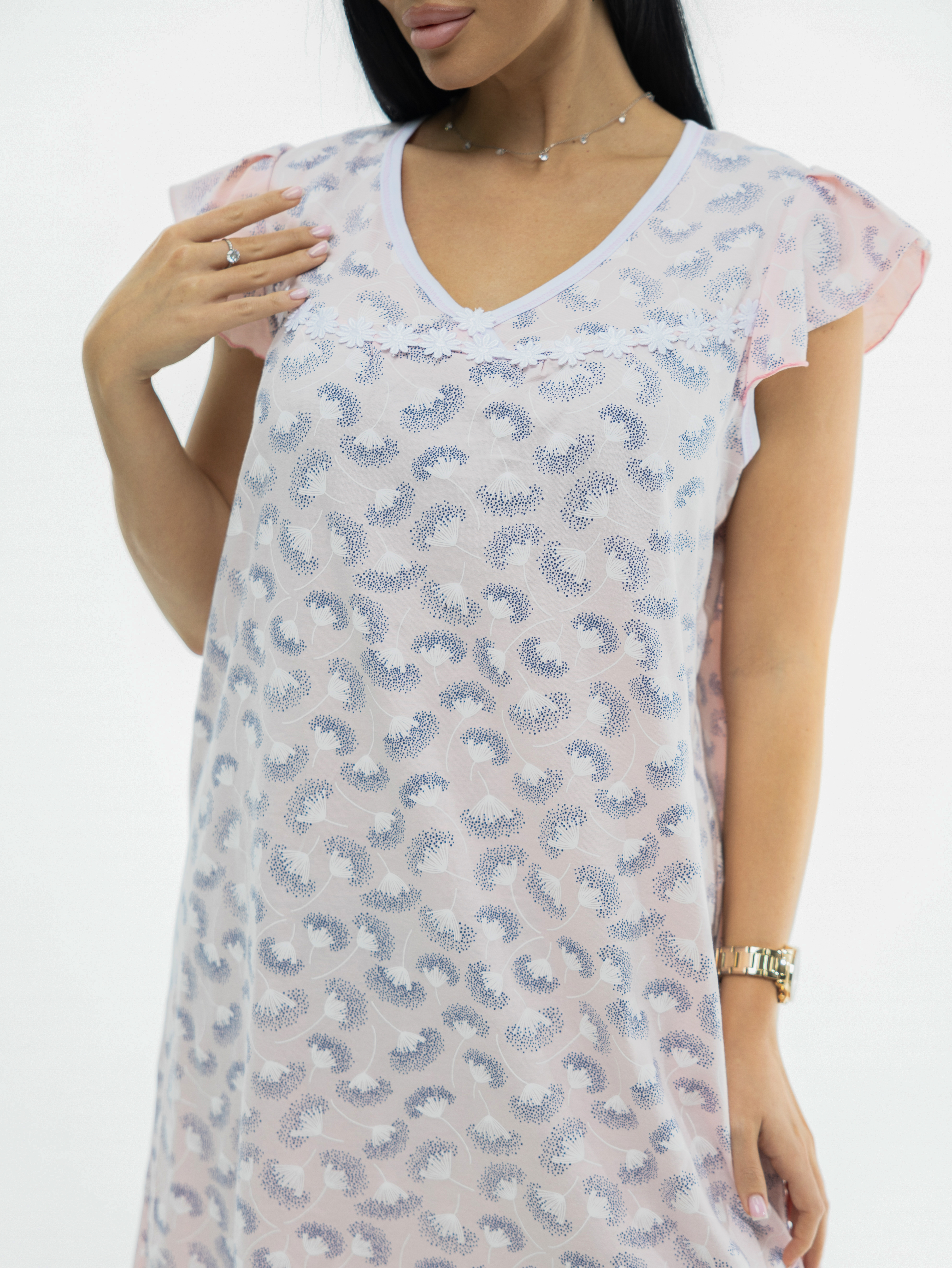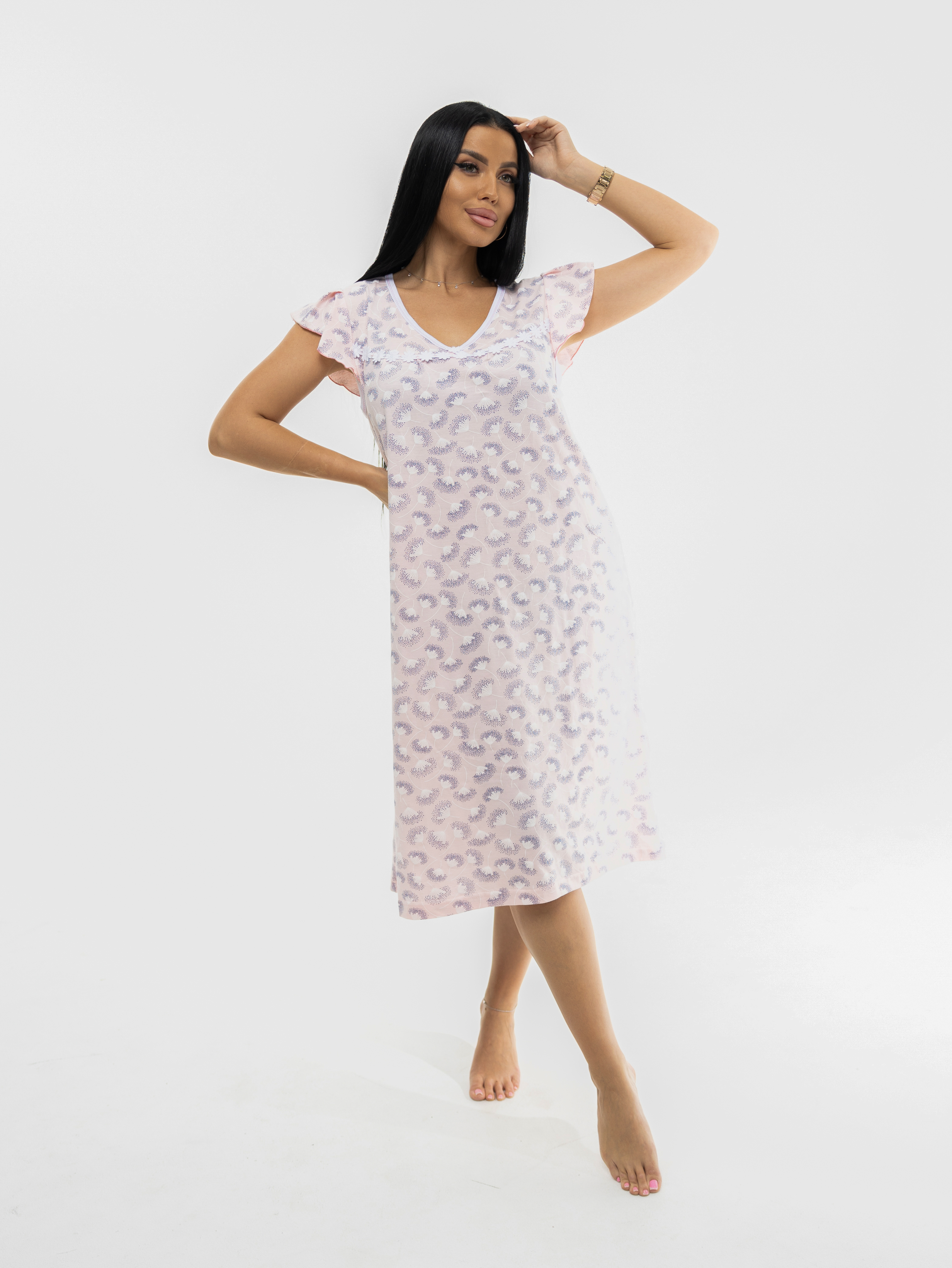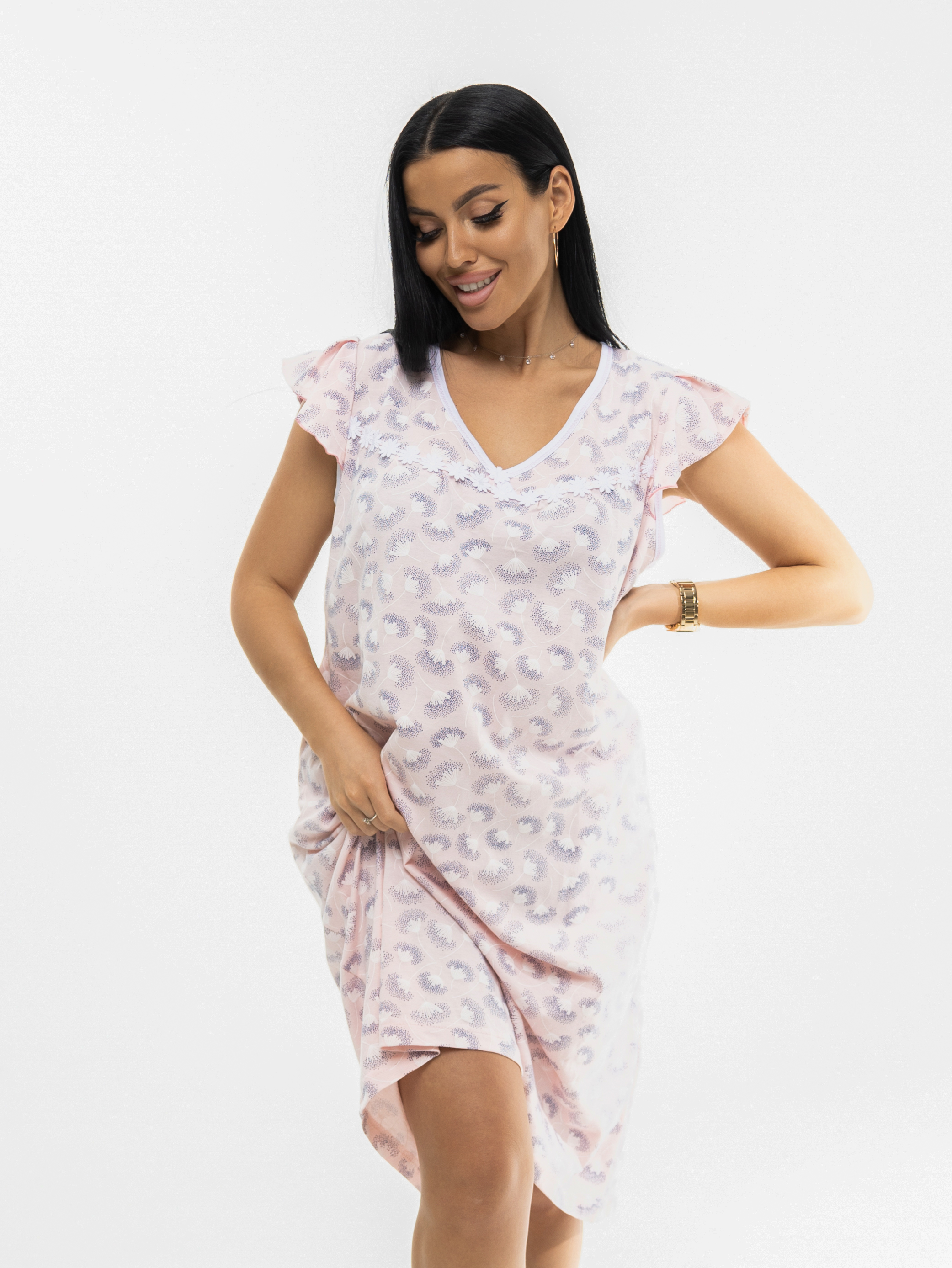 Женская ночная сорочка из 100% хлопка, длиной ниже колена. Сорочка выполнена из набивной кулирки. Рукав волан добавляет игривости образу, а расклешение сорочки к низу обеспечивает комфортный сон.