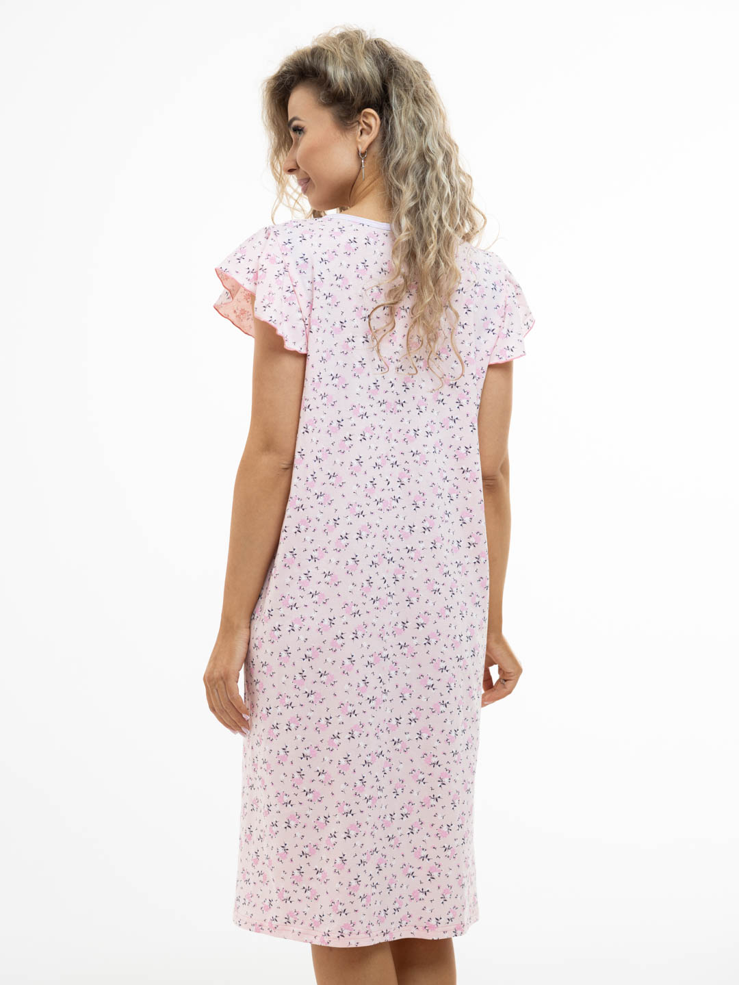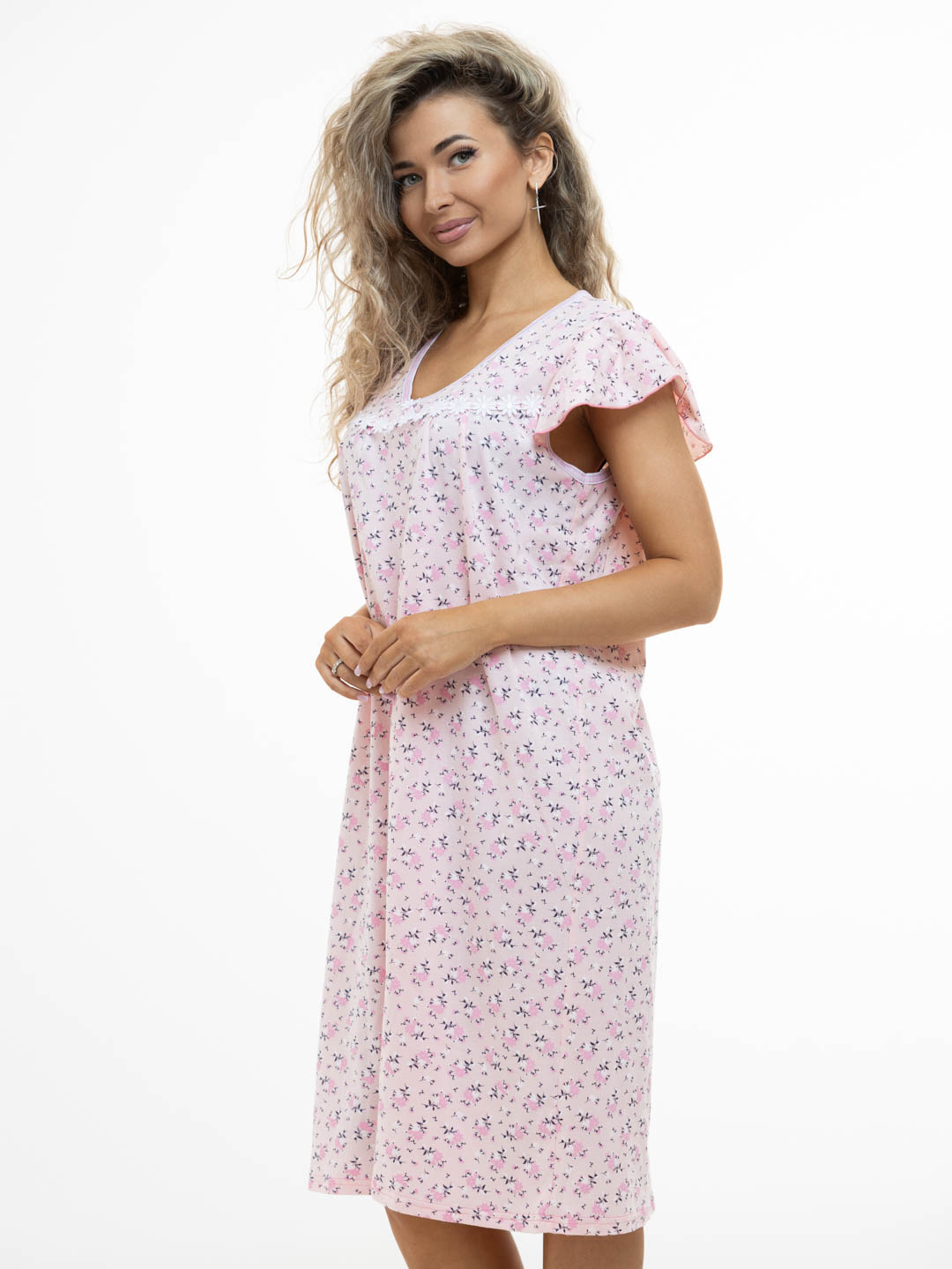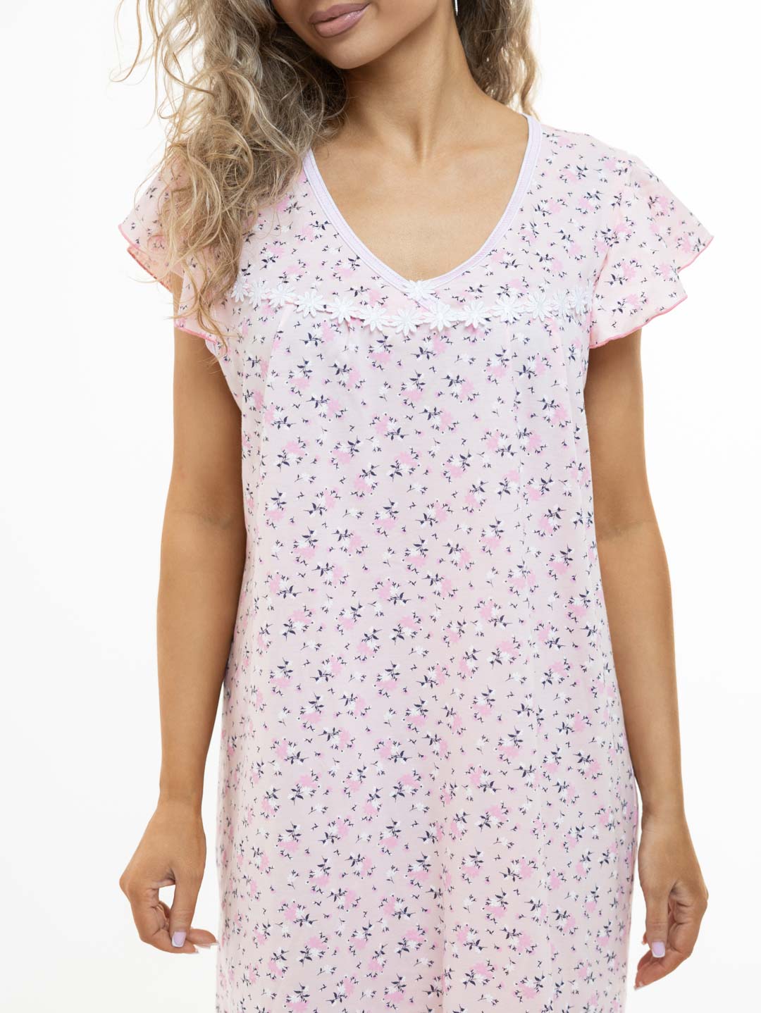 Женская ночная сорочка из 100% хлопка, длиной ниже колена. Сорочка выполнена из набивной кулирки. Рукав волан добавляет игривости образу, а расклешение сорочки к низу обеспечивает комфортный сон.