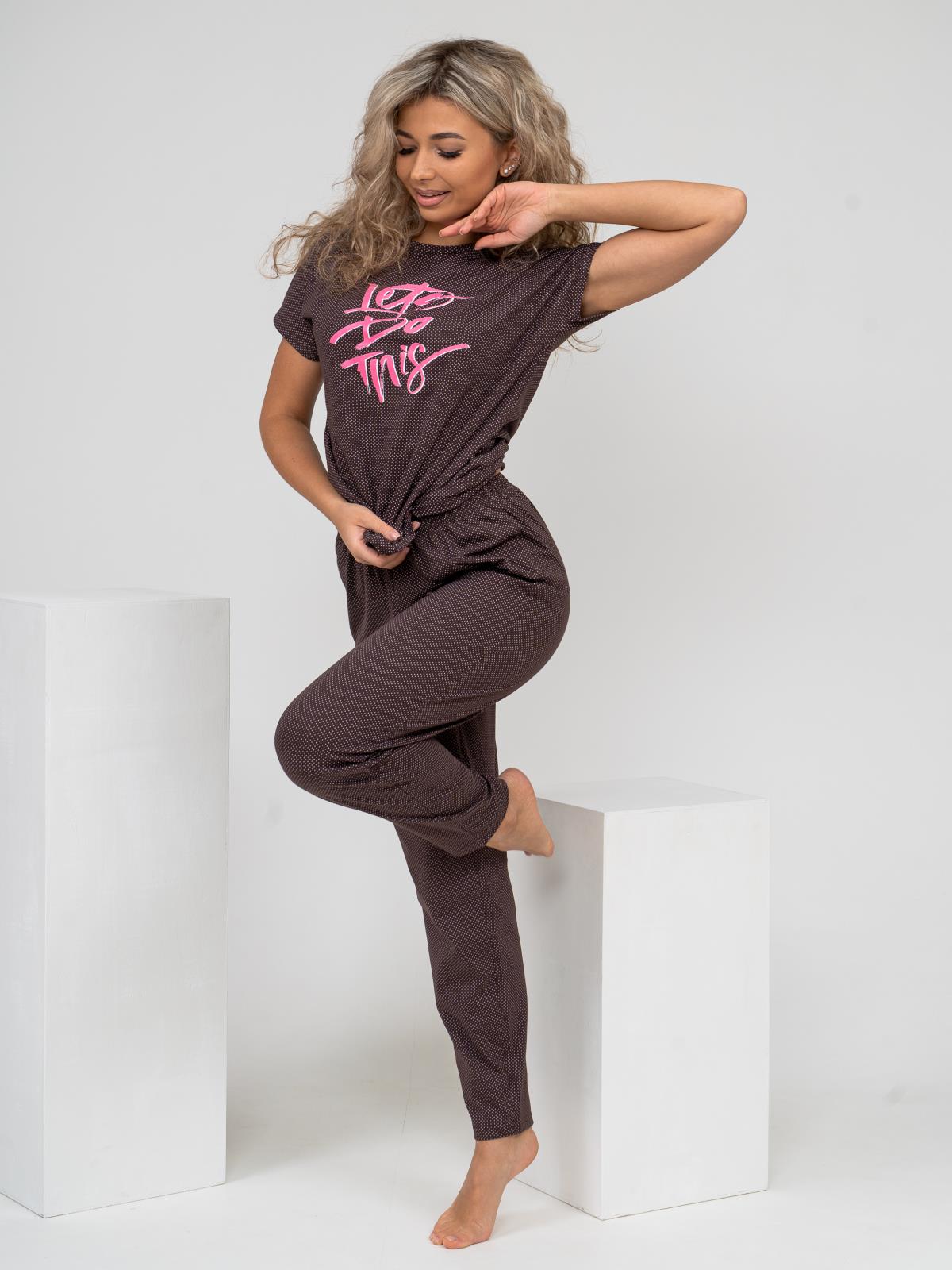 Женская пижама со штанами выполнена из мягкого и качественного 100% хлопка. Ткань гиппоаллергенна и поэтому идеально подходит, не вызывает аллергических реакций и раздражений нежной кожи. Пижама женская имеет следующий комплект: футболка свободного кроя с яркой печатью и пижамные брюки на мягкой резинке. Пижама женская со штанами удобная и практичная одежда для дома, идеально подойдет для сна, пижамной вечеринки и повседневной носки по дому.