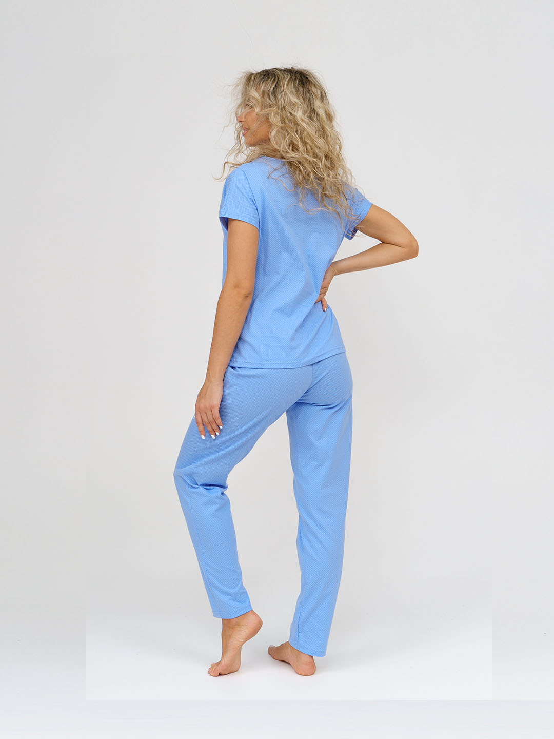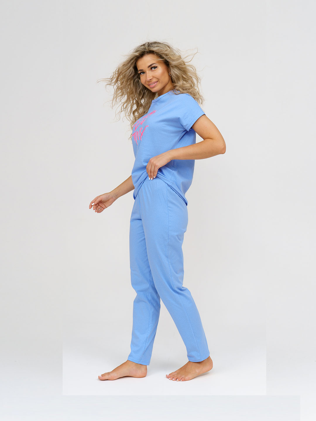 Женская пижама со штанами выполнена из мягкого и качественного 100% хлопка. Ткань гиппоаллергенна и поэтому идеально подходит, не вызывает аллергических реакций и раздражений нежной кожи. Пижама женская имеет следующий комплект: футболка свободного кроя с яркой печатью и пижамные брюки на мягкой резинке. Пижама женская со штанами удобная и практичная одежда для дома, идеально подойдет для сна, пижамной вечеринки и повседневной носки по дому.