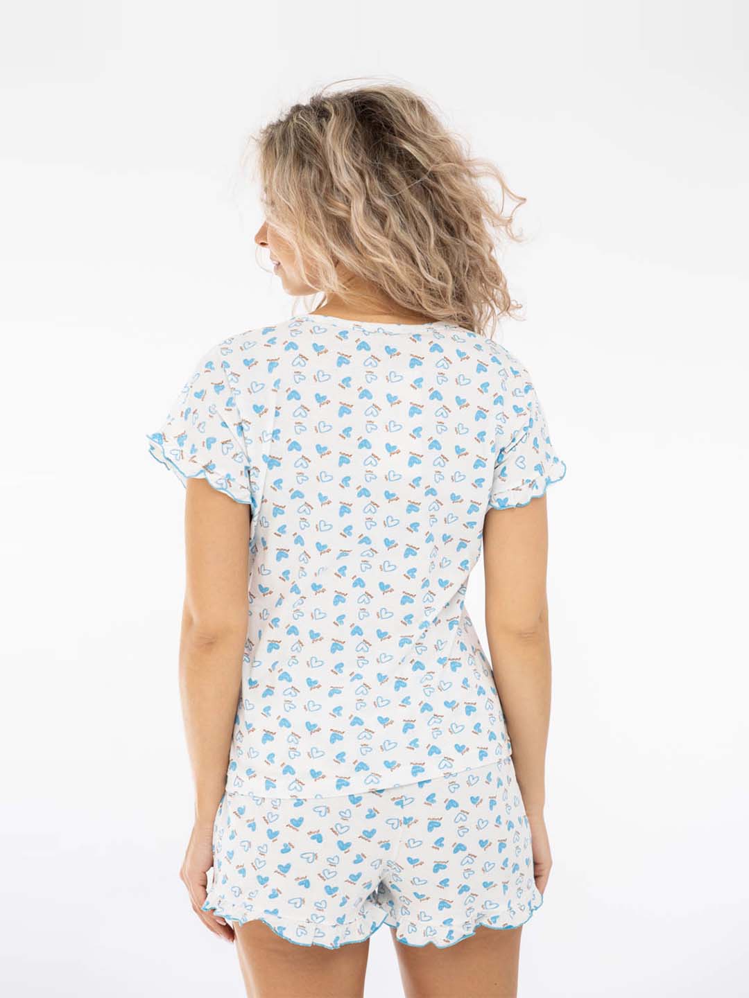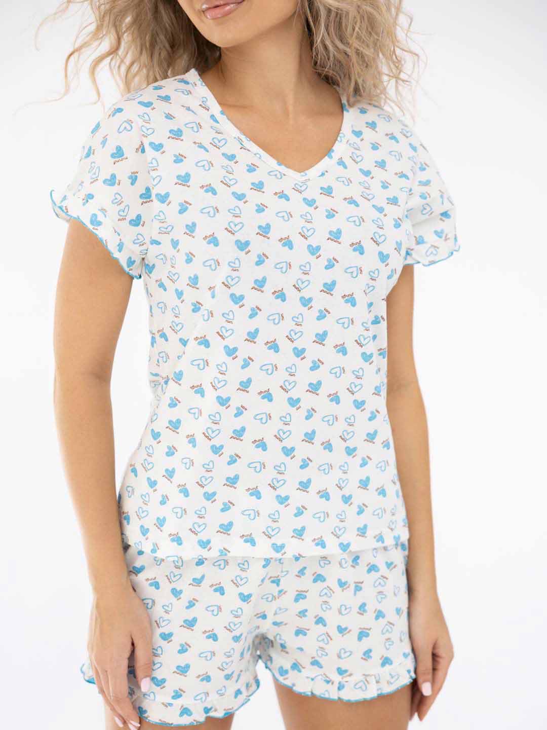 Молодежная пижама из 100% хлопка. Футблка с V-образным вырезом и рюшечками на рукавах. Шорты мини без карманов с милыми рюшечками.