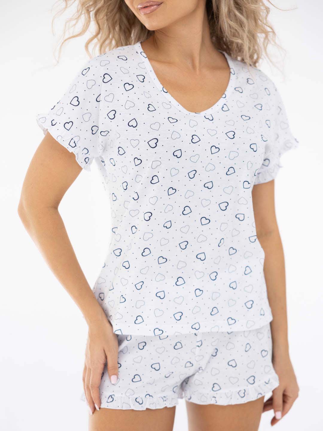 Молодежная пижама из 100% хлопка. Футблка с V-образным вырезом и рюшечками на рукавах. Шорты мини без карманов с милыми рюшечками.