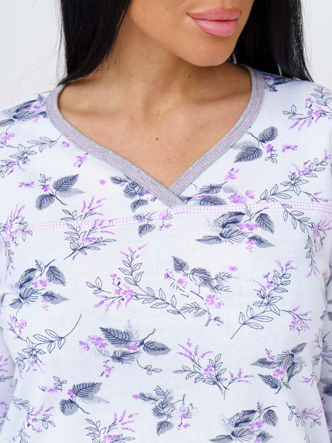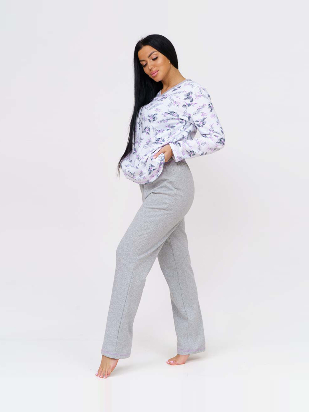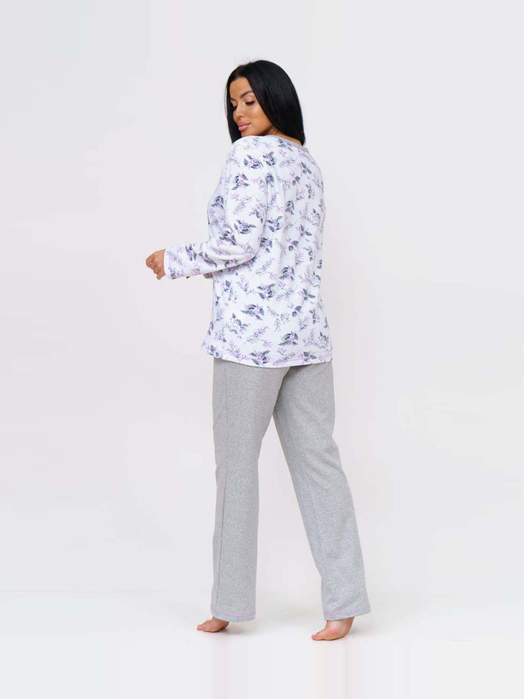 Женская пижама из прияттной трикотажной ткани с мягким начесом. Отличный комплект для сна и отдыха, в нем Вы будете засыпать с комфортом. Пижама выполнена из тканей компаньонов, которые идеально подходят друг другу. Верх свободного силуэта, не сковывает двидения, с кокеткой на запах. Брюки свободного силуэта, полноценной длины, без карманов.