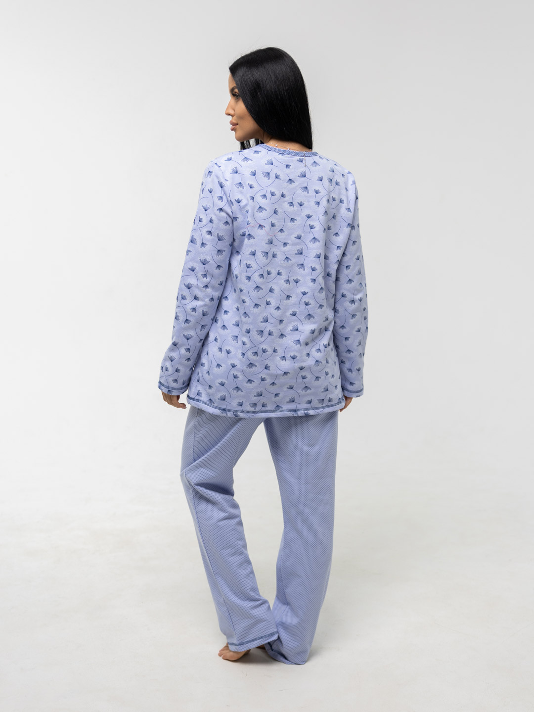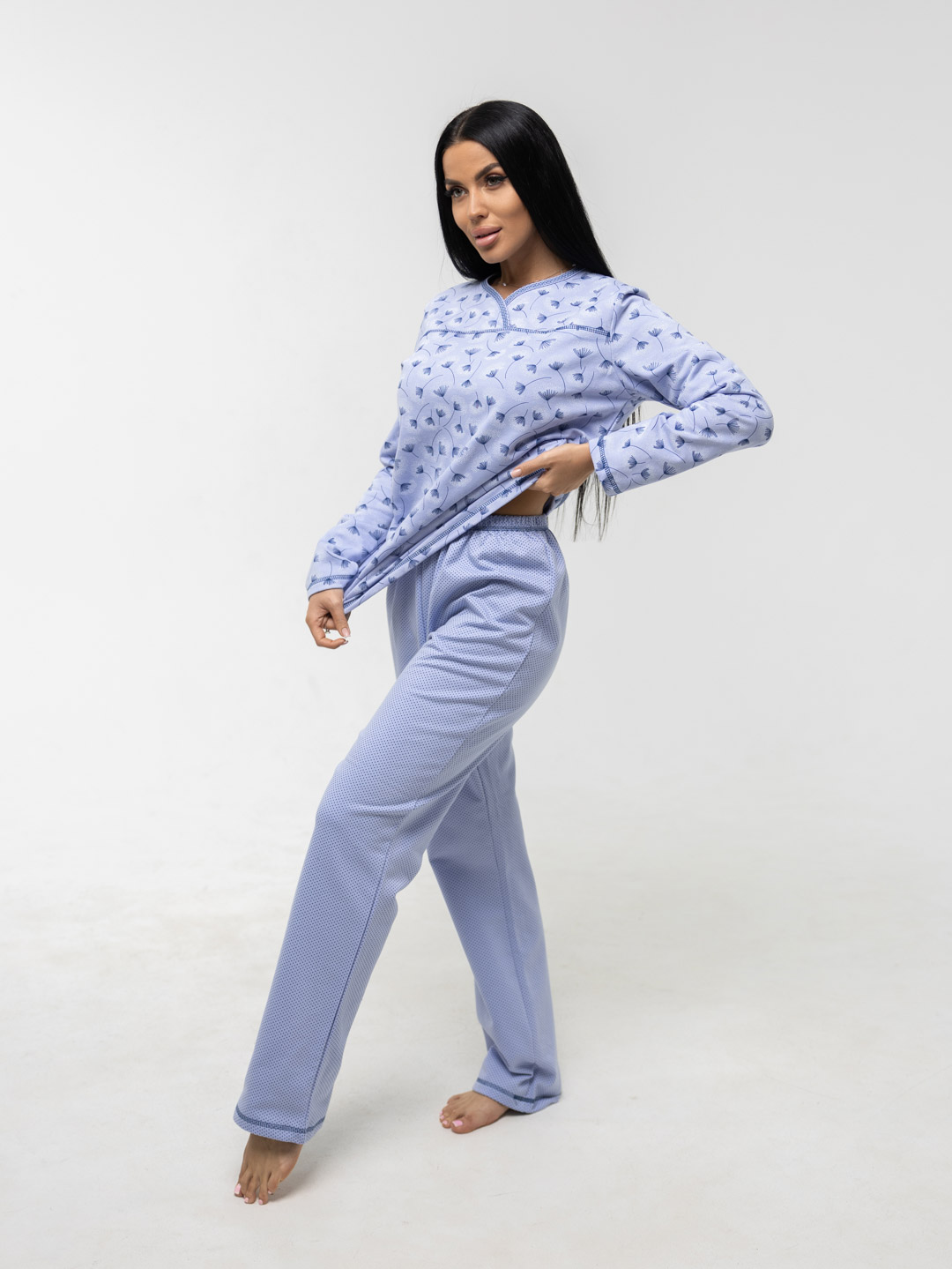 Женская пижама из приятной трикотажной ткани с мягким начесом. Отличный комплект для сна и отдыха, в нем Вы будете засыпать с комфортом. Пижама выполнена из тканей компаньонов, которые идеально подходят друг другу. Верх свободный, не сковывает движения, с кокеткой на запах. Брюки свободного силуэта, полноценной длины, без карманов.
