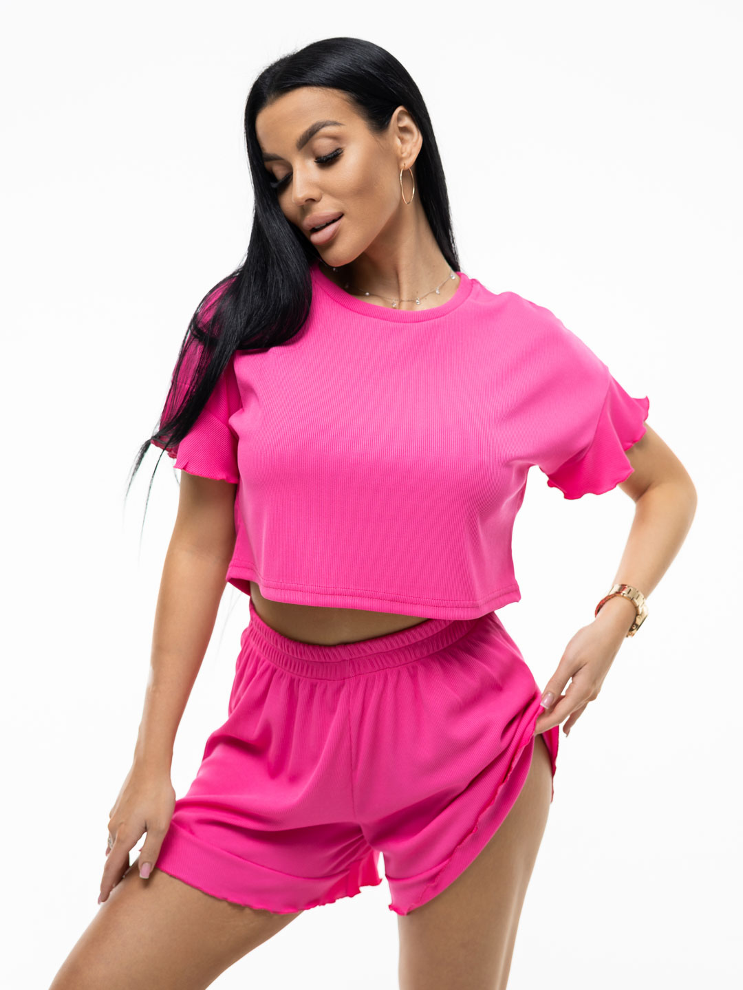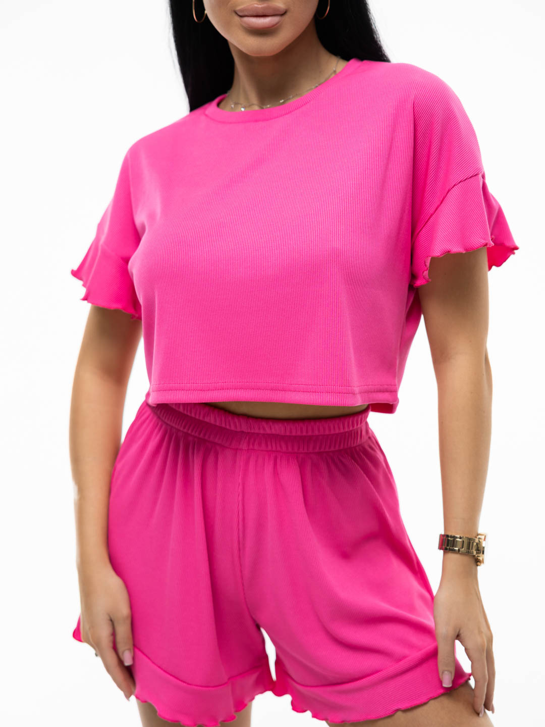 Молодежная пижама в ультрамодной яркой расцветке, материал очень легкий и приятный на ощупь, в мелкий рубчик. Топ с О-образной горловиной и коротким рукавом-воланом. Шорты на мягкой резинке с воланами по низу.